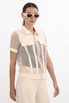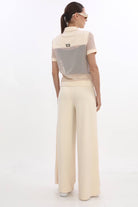 Дамски комплект от 2 части спортен с широк панталон и прозрачно горнище с цип и якичка в кремав цвят 37767-002