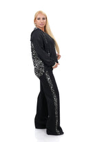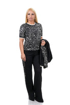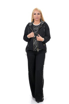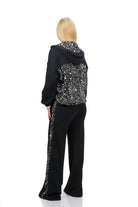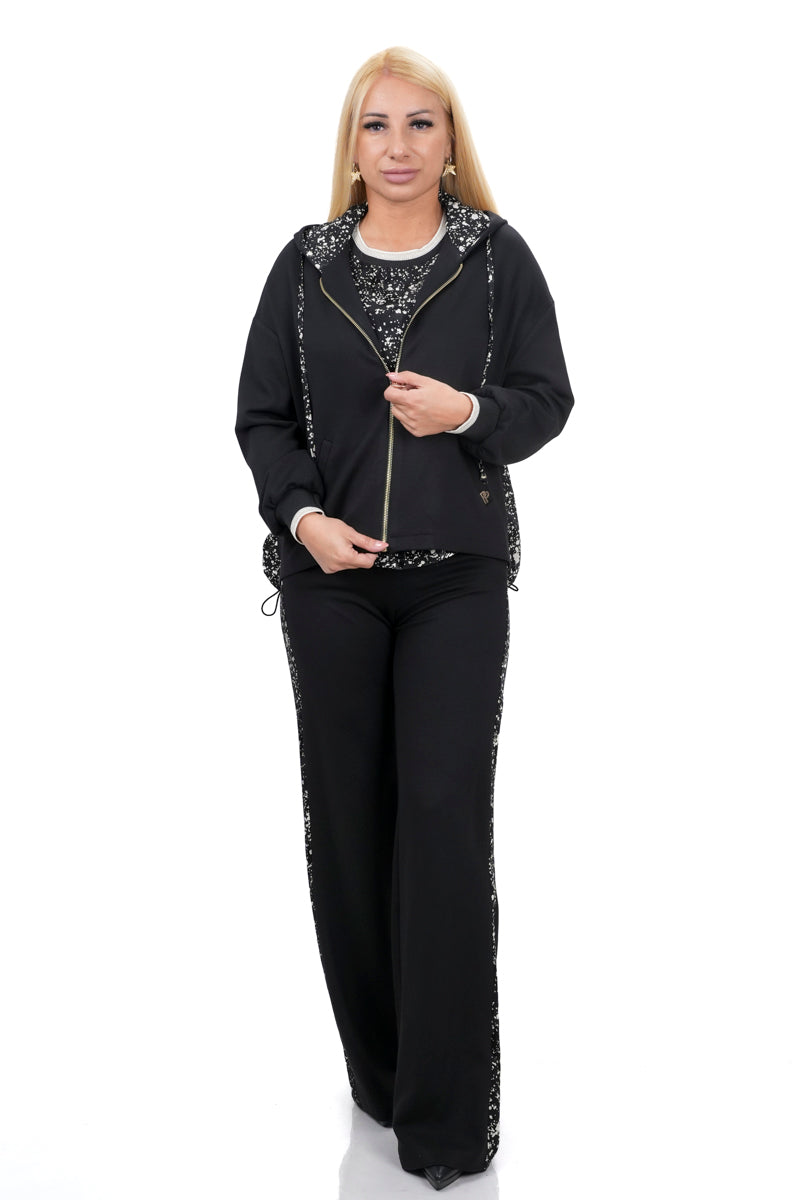 Дамски комплект спортно-елегантен от 3 части с широк панталон + блуза + суитшърт с качулка в черно и бяло 7381