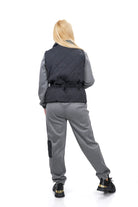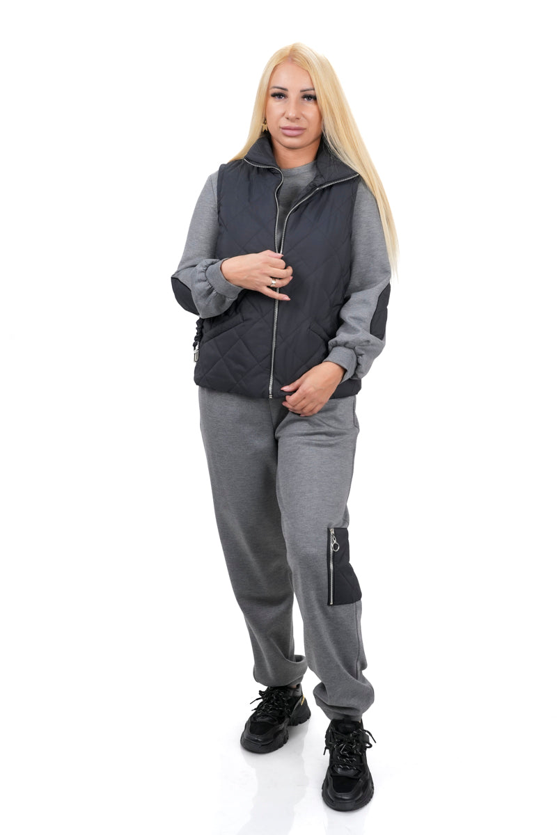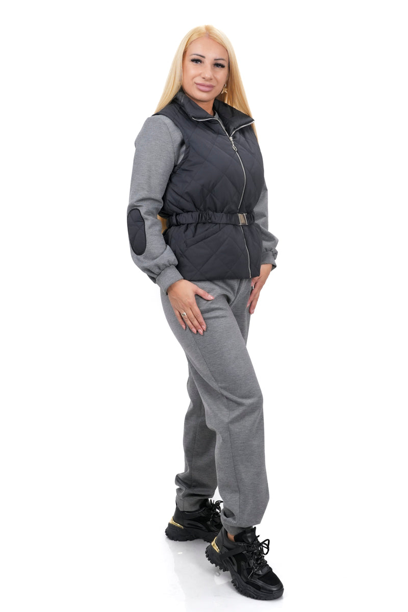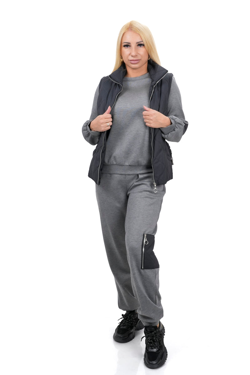Дамски комплект ежедневен от 3 части с елек в черно + панталон и блуза в сиво 08-2225