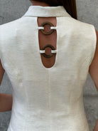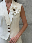 Дамски костюм от 2 части с широк панталон и елек с 3D цвете в екрю меланж 1238