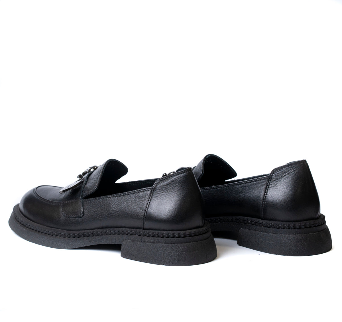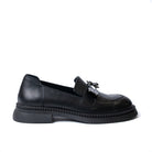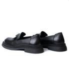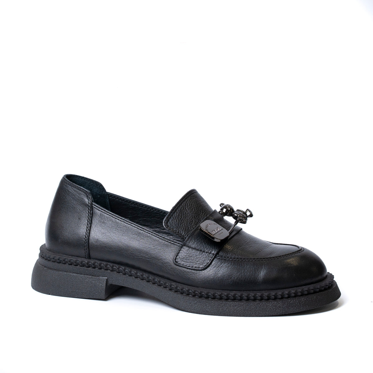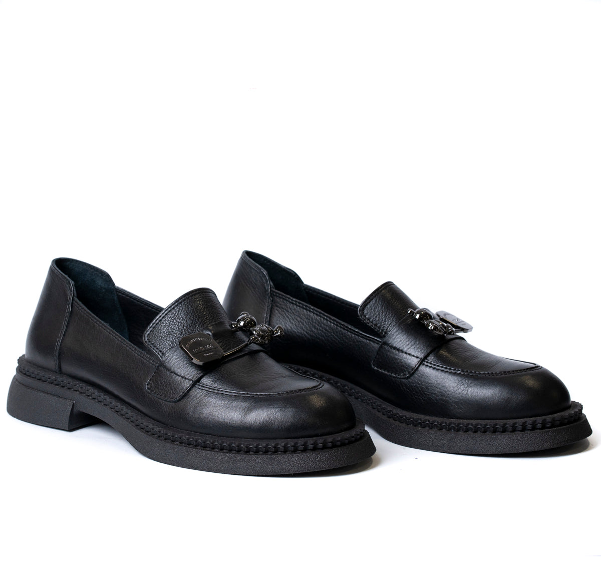 Дамски обувки лоуфър от естествена кожа с брошка с мече в черно 1504-01