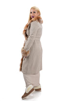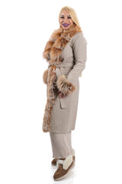 Дамско палто дълго от естествена кожа от Алпака в бежово с естествен косъм от лисица в кафяво 9099