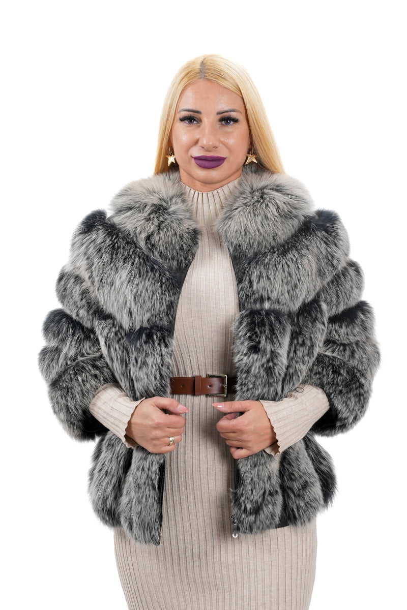Дамско палто късо от естествена кожа и косъм на редове в сиво сребърно 07