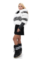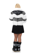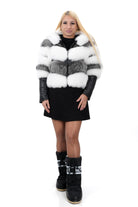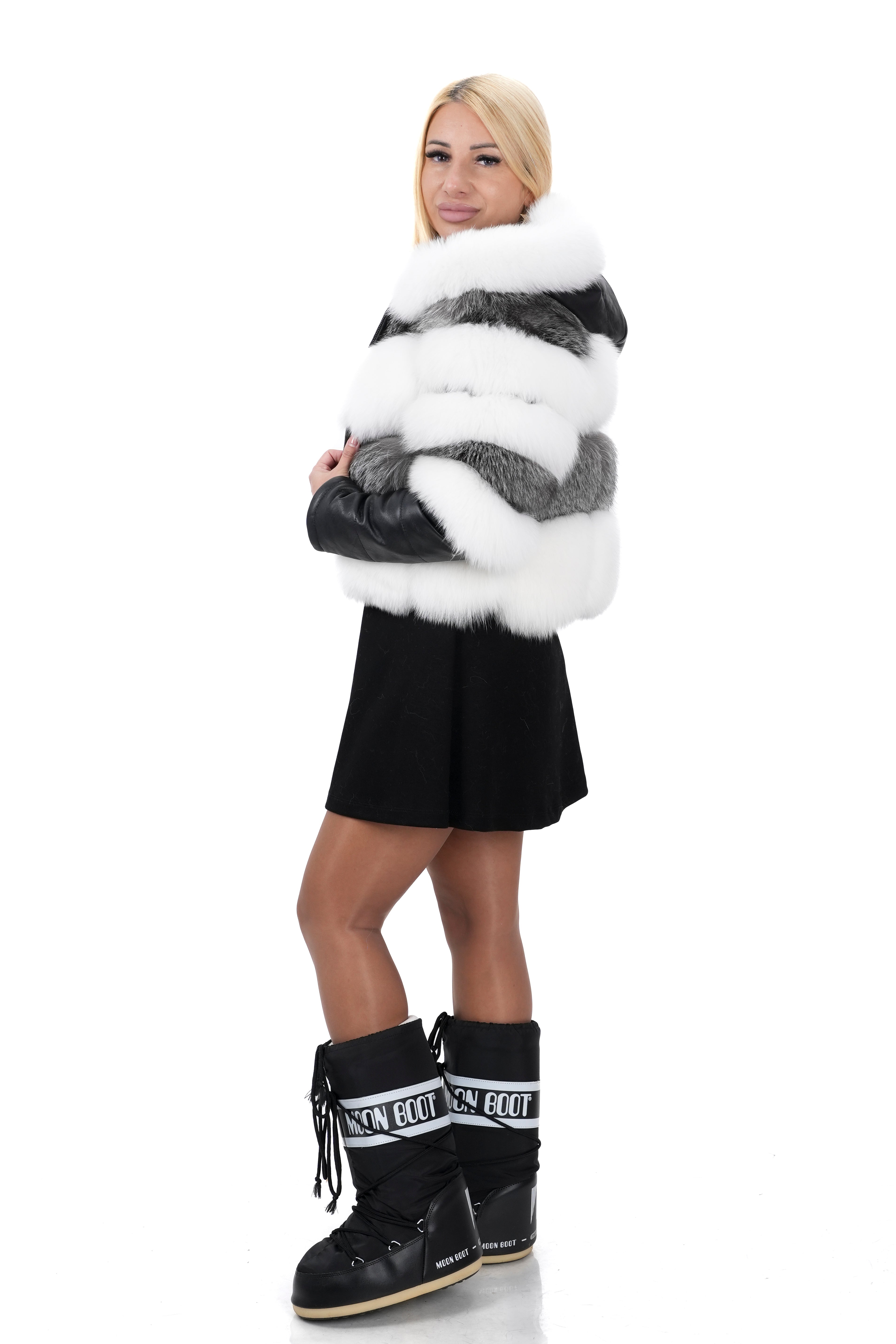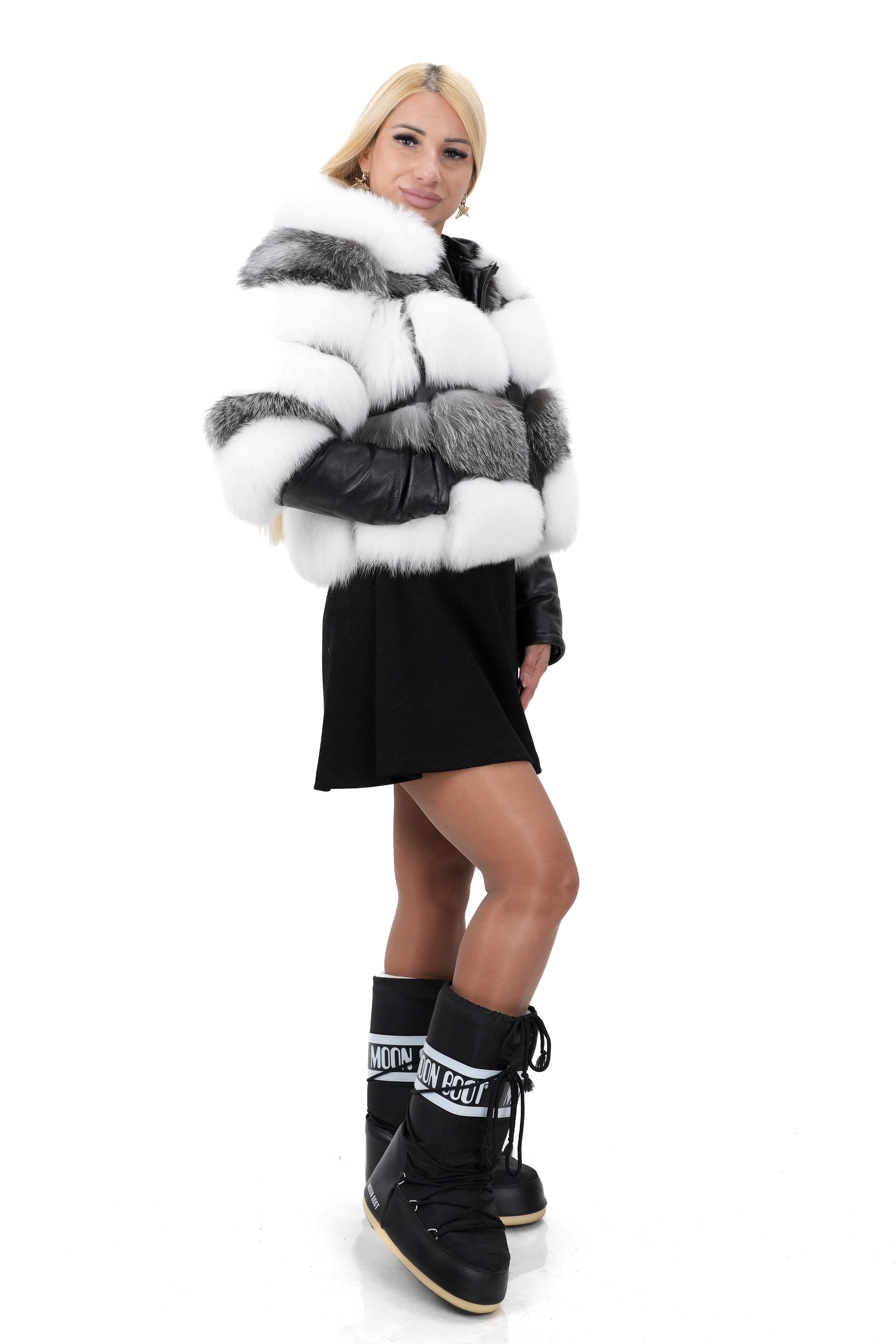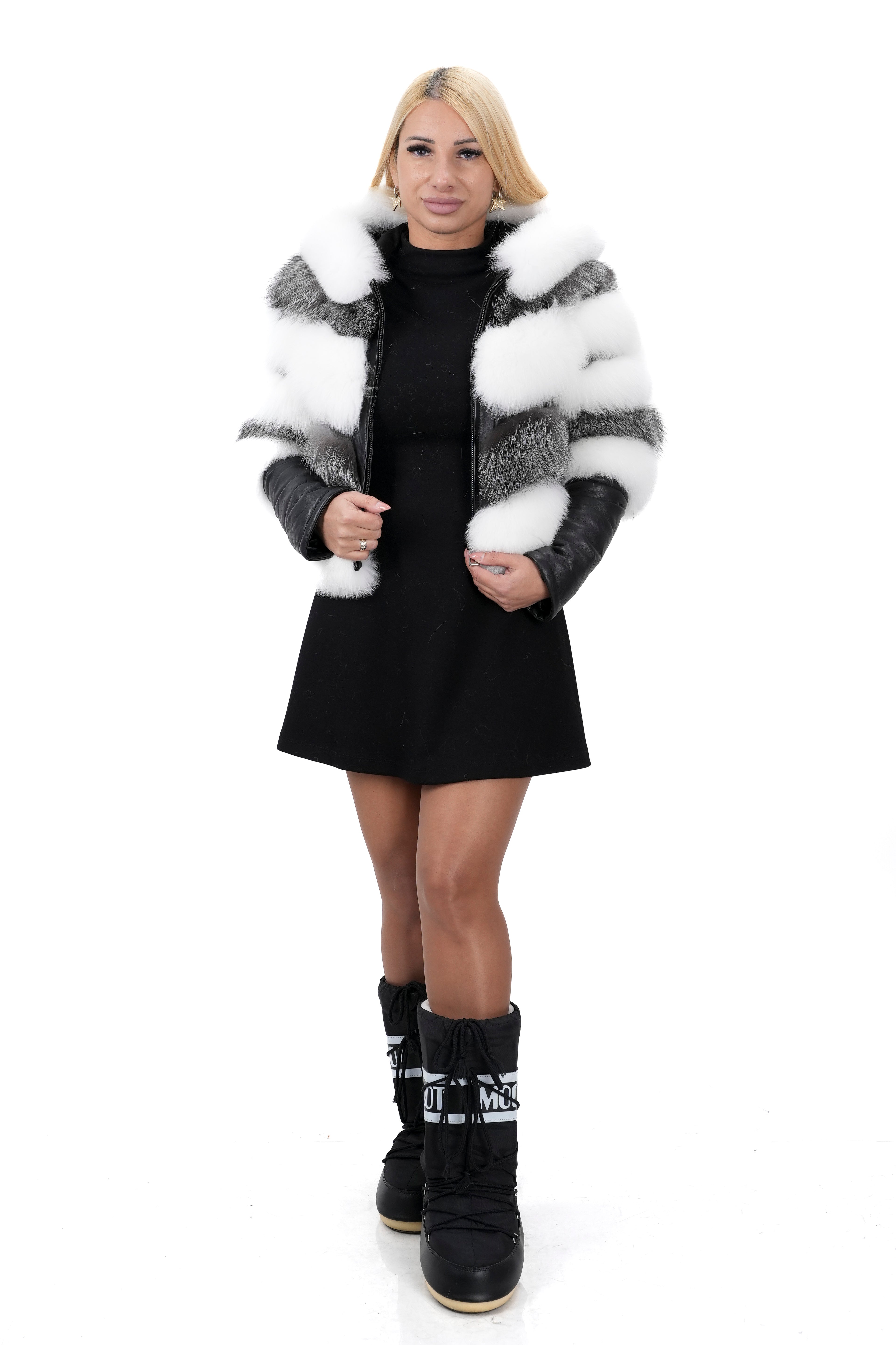 Дамско палто късо от естествена кожа в черно и косъм с качулка в сребърно и бяло М-045