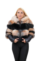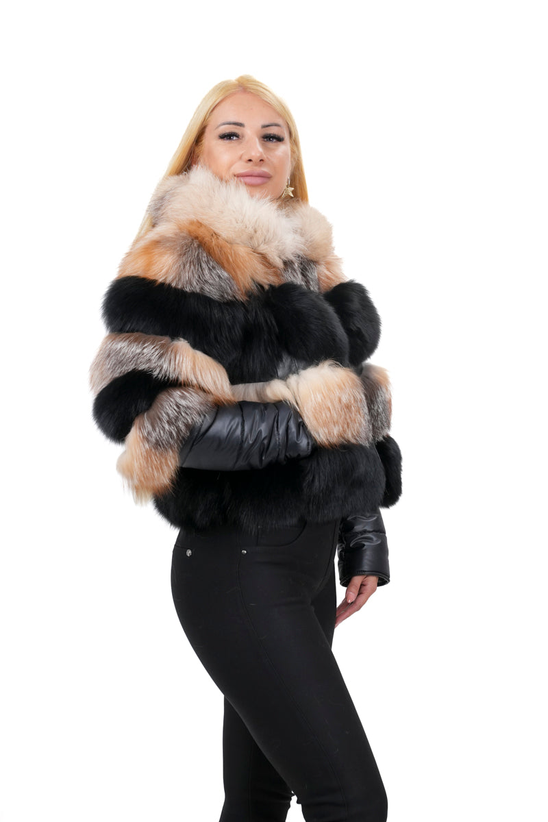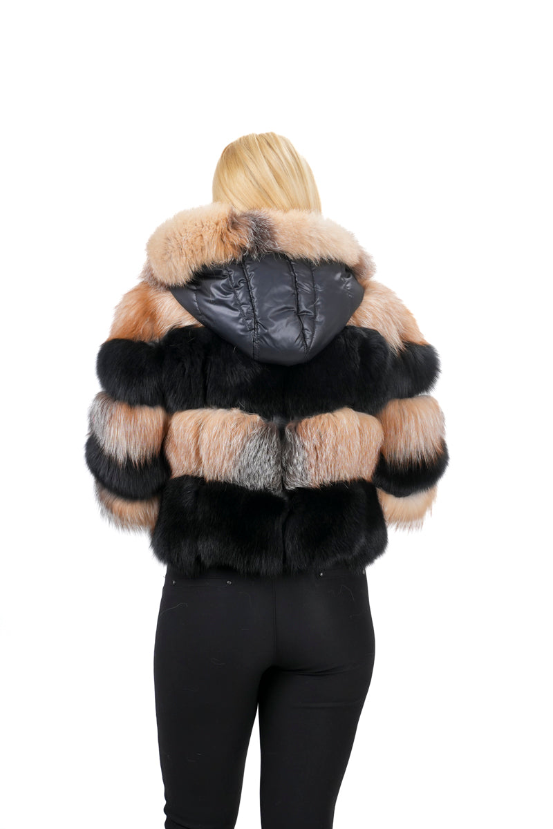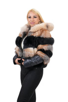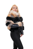 Дамско палто късо от естествен косъм с качулка в златна лисица и черно М-045