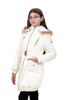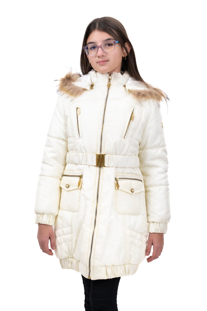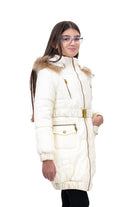 Детско яке за момиче дълго със сваляща се качулка с естествен пух и колан на талията в екрю 1418