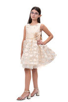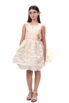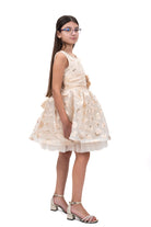 Детска рокля за момиче къса официална разкроена в златно с панделка на гърба и ПОДАРЪК ШНОЛА ЗА КОСА 33078