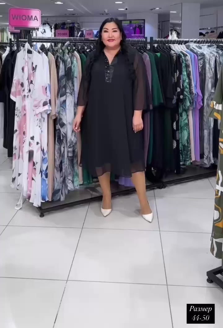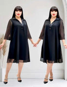 Дамска рокля разкроена ефирна в черно с прозрачен ръкав и якичка 4706