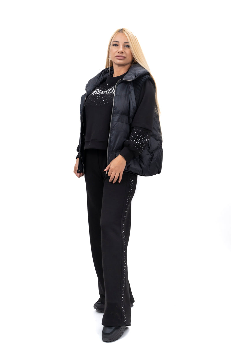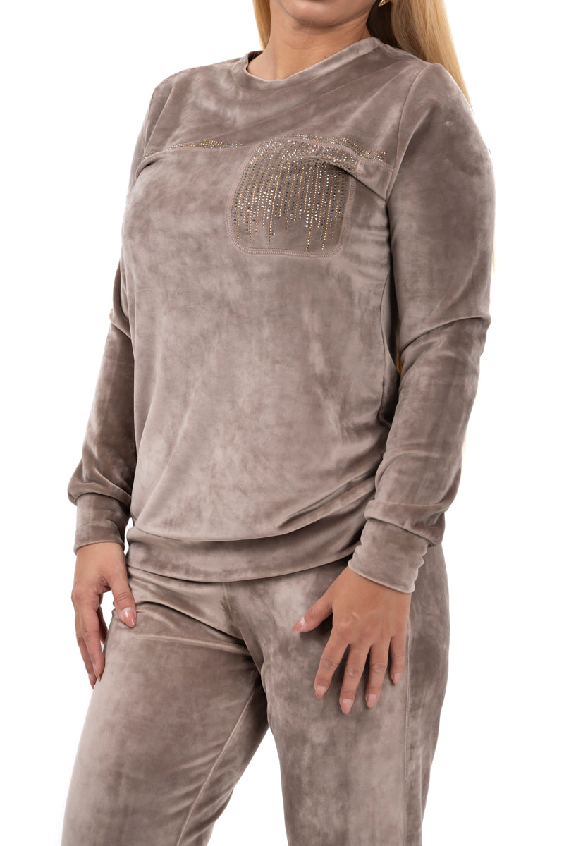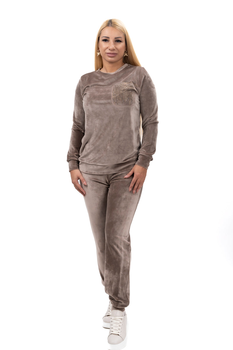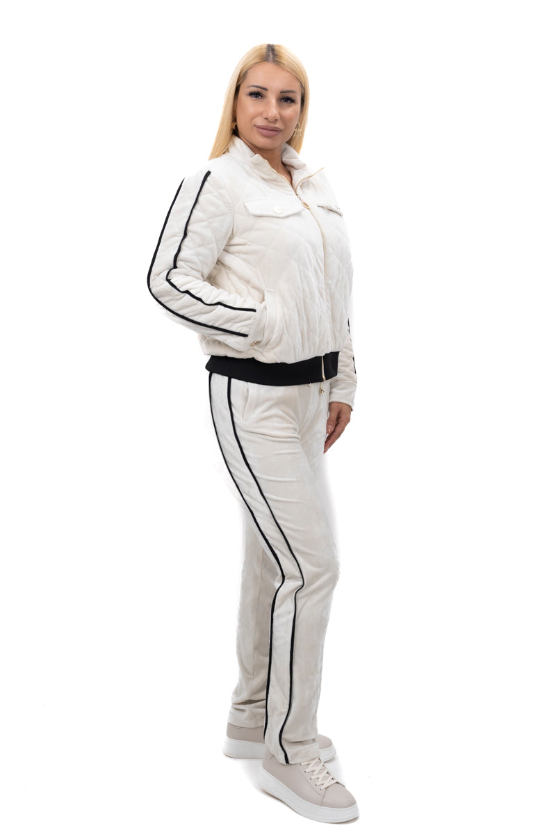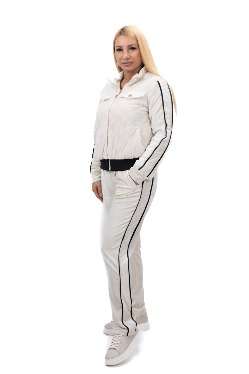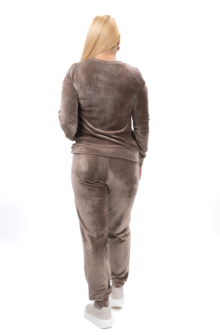 Дамски комплект спортно-елегантен от 2 части с прав панталон и суитшърт от мек плюш в черно и бежово 19576