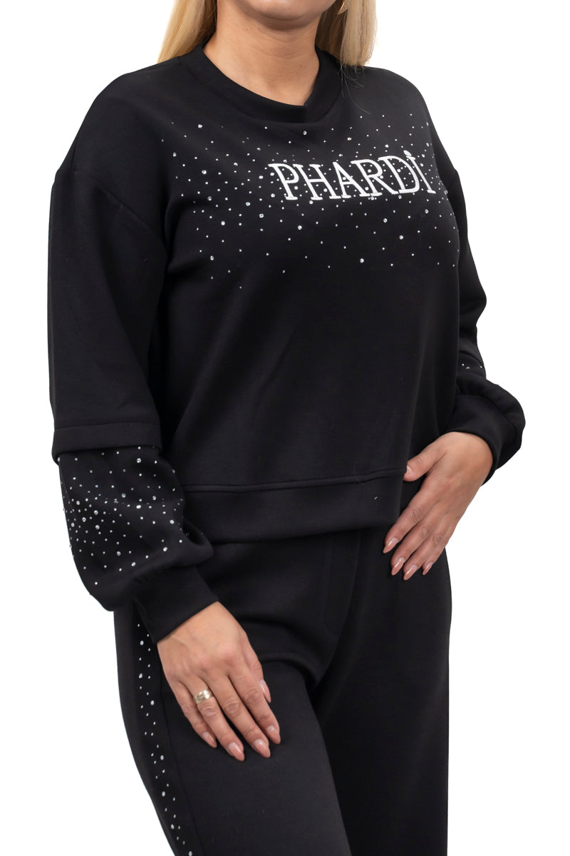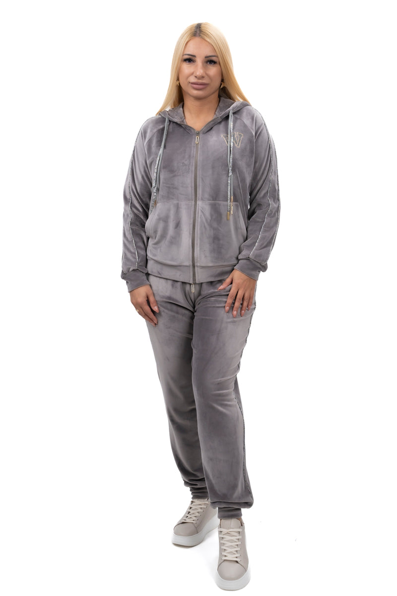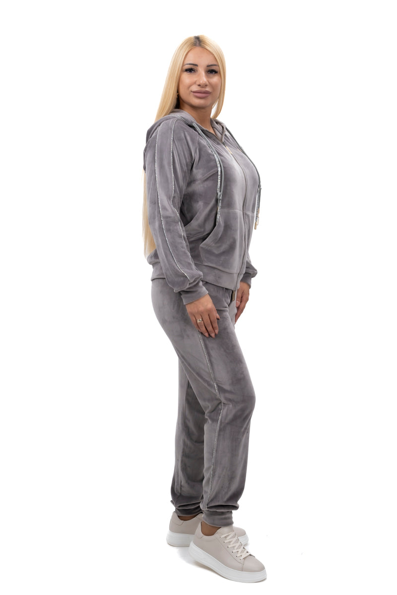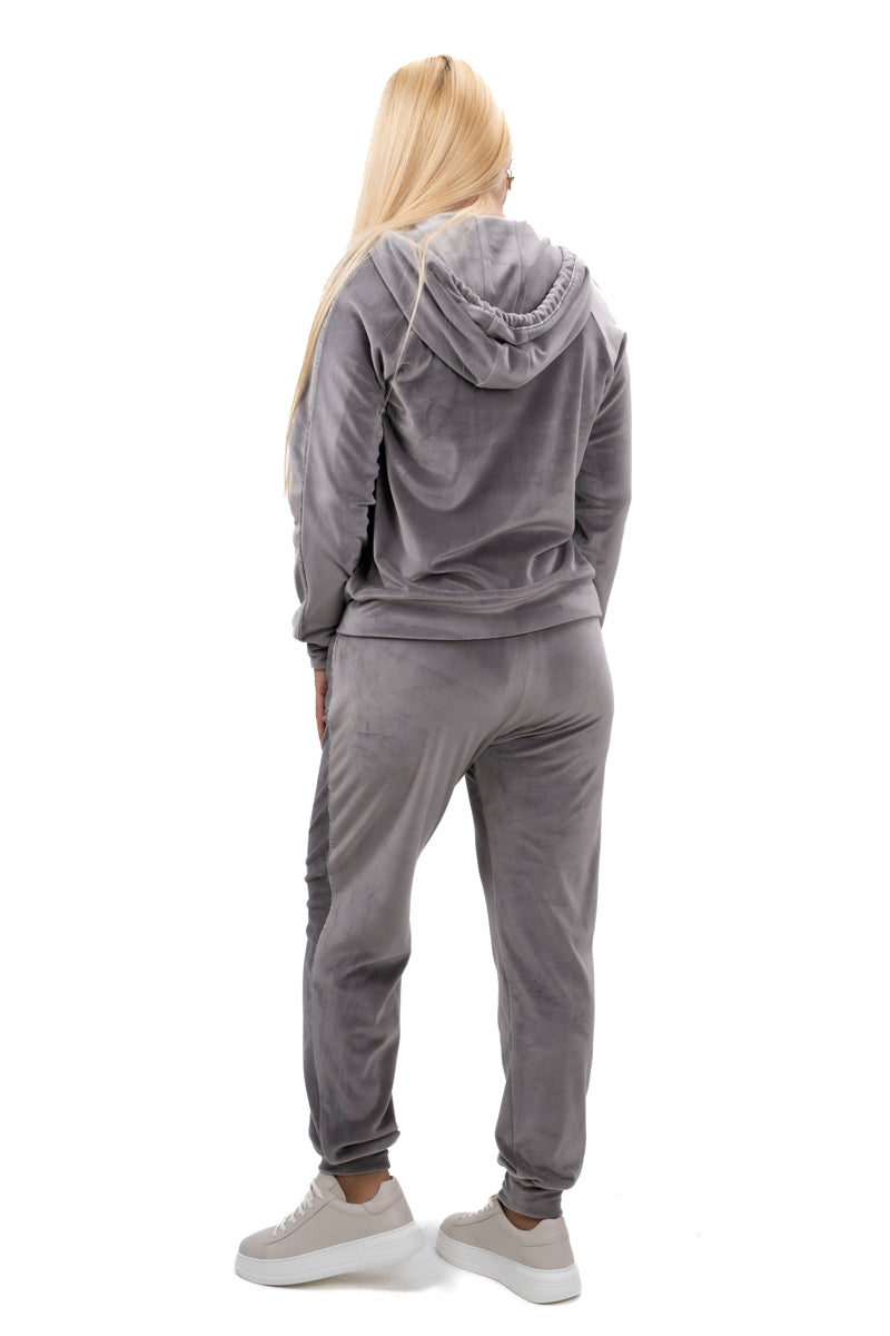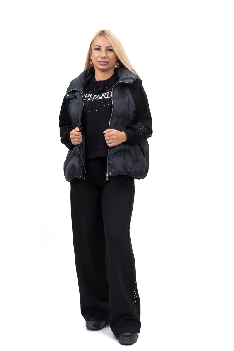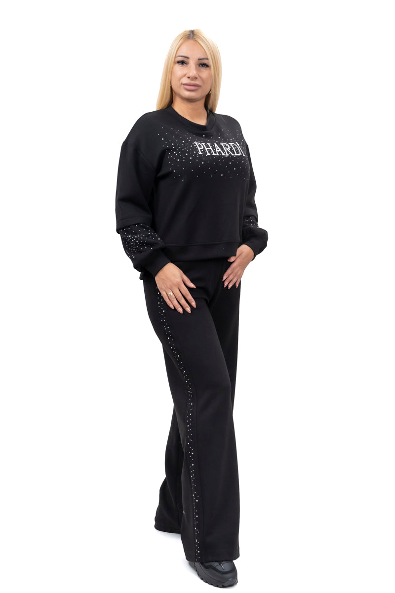 Дамски комплект спортно-елегантен от 2 части с прав панталон и суитшърт от мек плюш в черно и бежово 19576