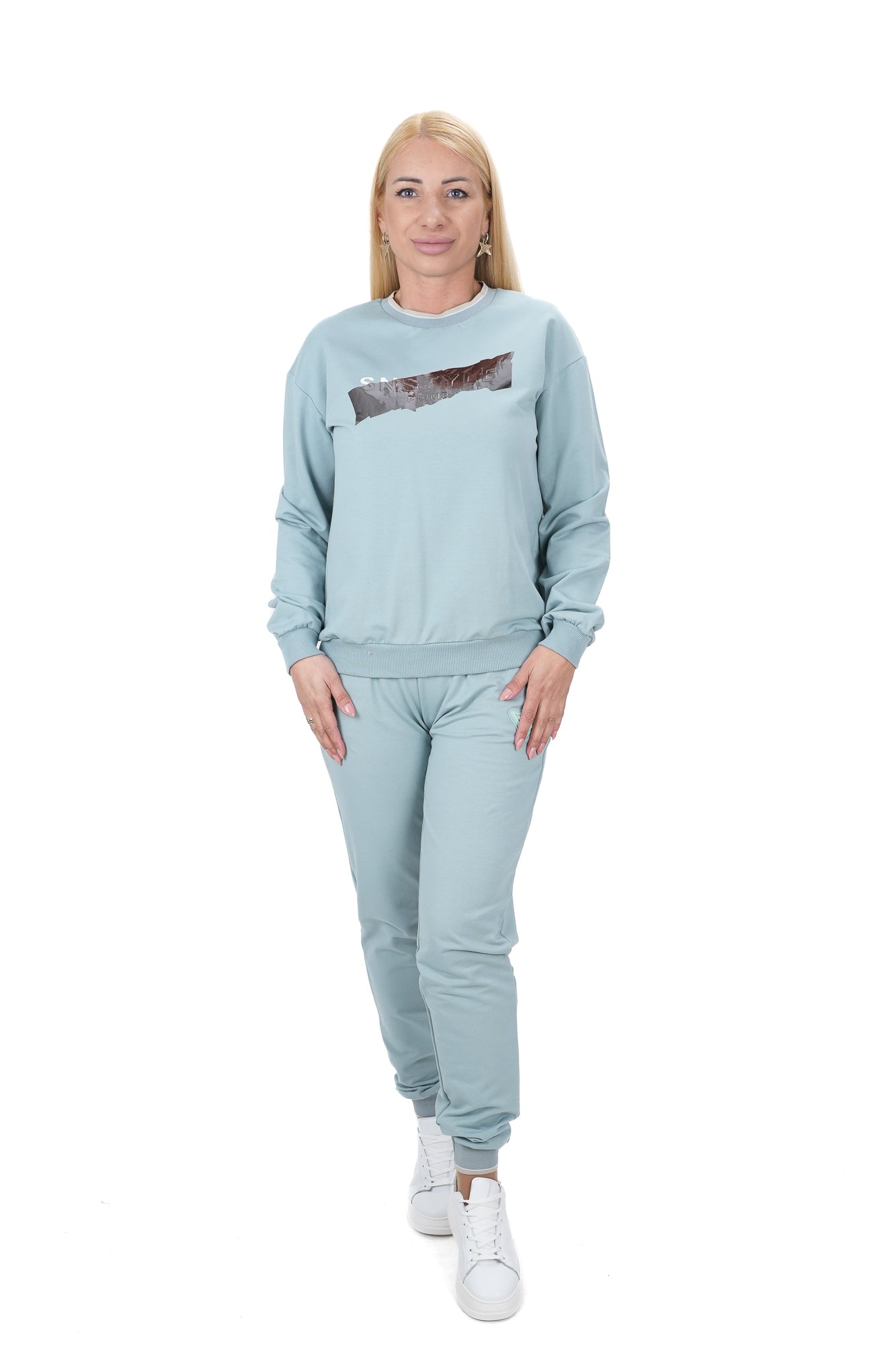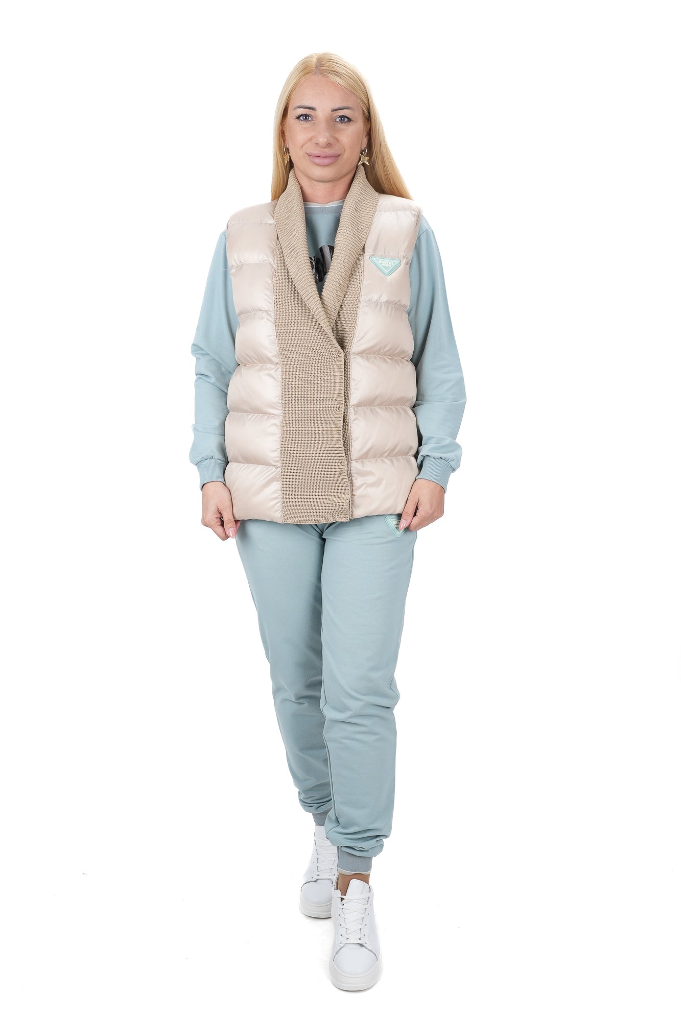 Дамски комплект от 3 части спортен с блуза и панталон в цвят мента и елек в бежово 3577-78