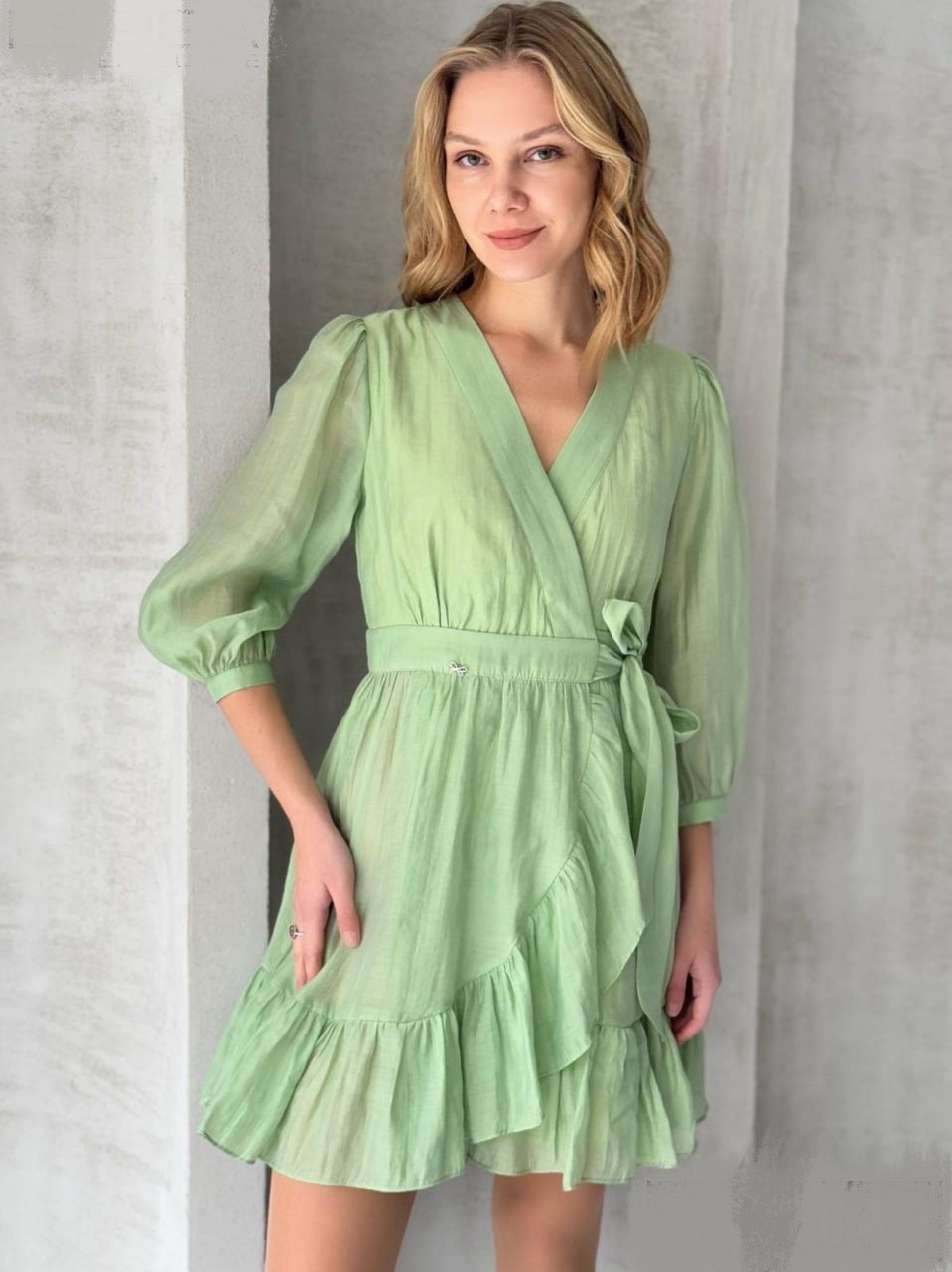 Дамска рокля в зелено с прехвърляне и странично връзване 51-5622