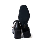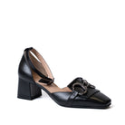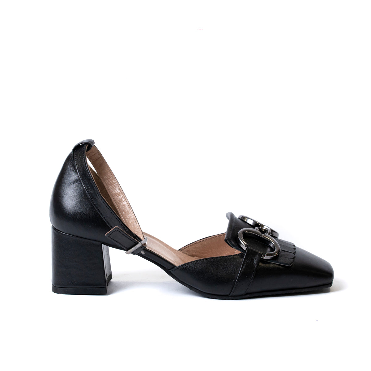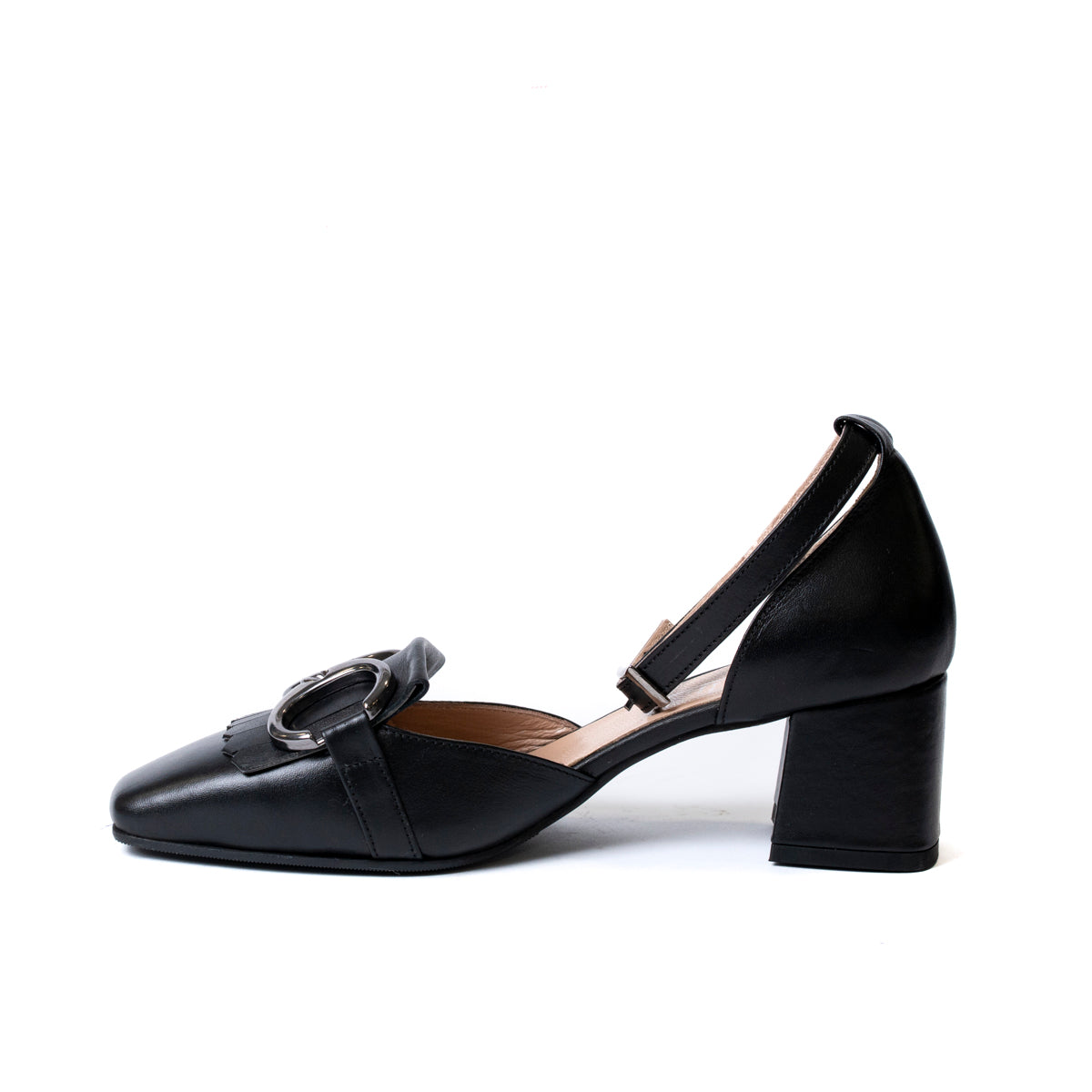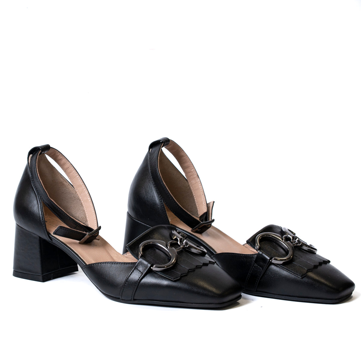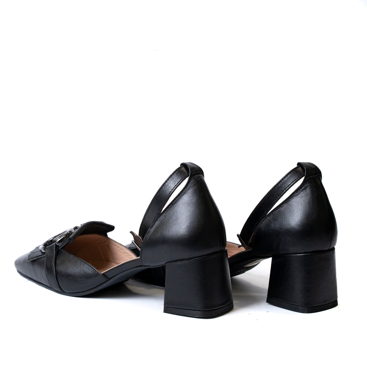 Обувки от естествена кожа в черно с нисък дебел ток,отстрани отворени със затворена пета и каишка на глезена.