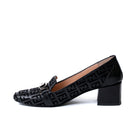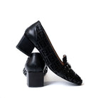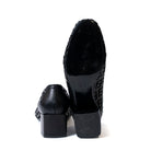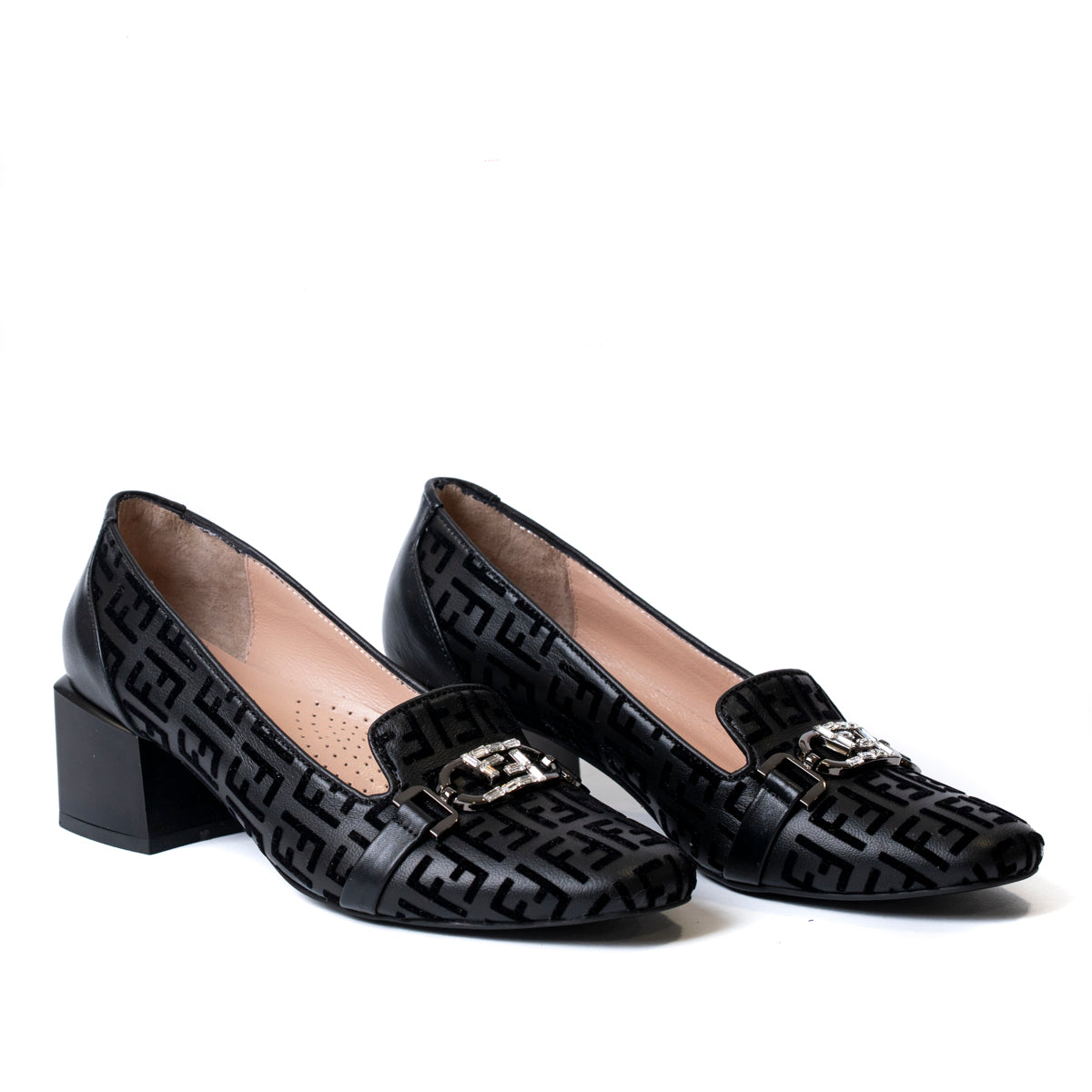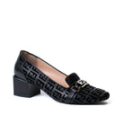 Елегантни обувки от естествена кожа с нисък дебел ток в черно и кадифени букви.