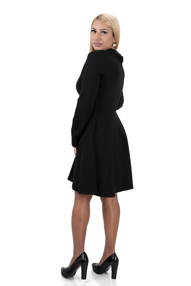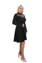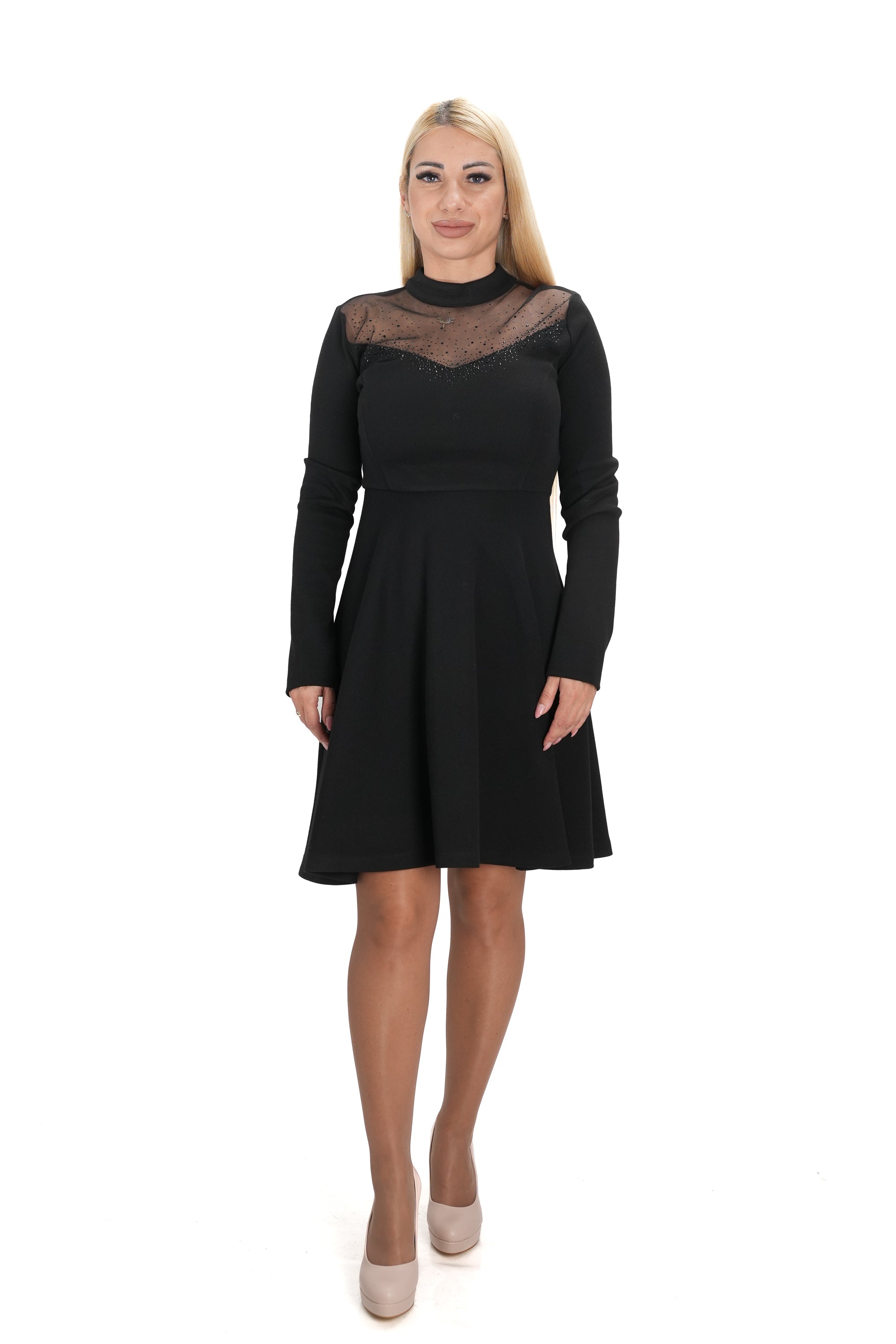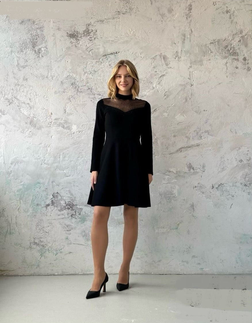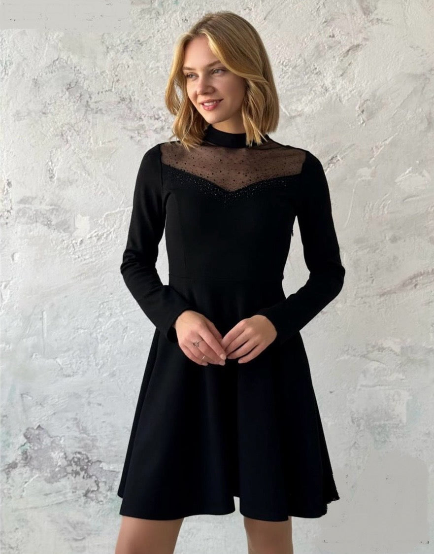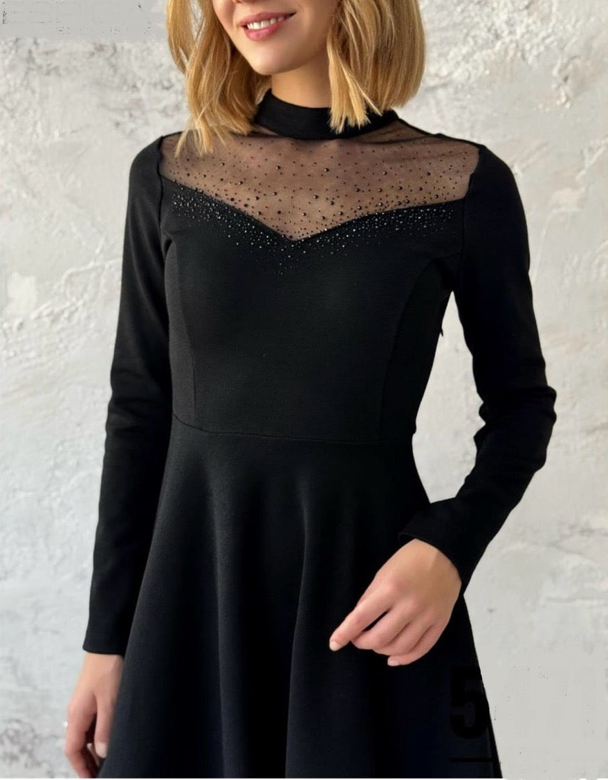 Дамска рокля къса разкроена с тюл и камъни на деколтето в черно 5471