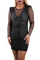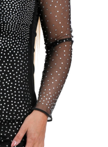 Дамска рокля къса елегантна по тялото в черно с тюлен ръкав и кристали 76141