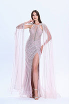 Дамска рокля дълга сватбена и бална по тялото в розово с много кристали и падащ ръкав от рамото до долу BU-021