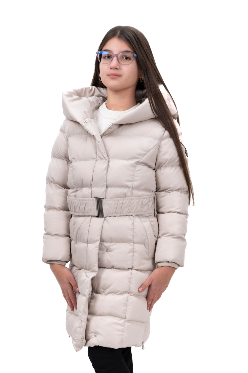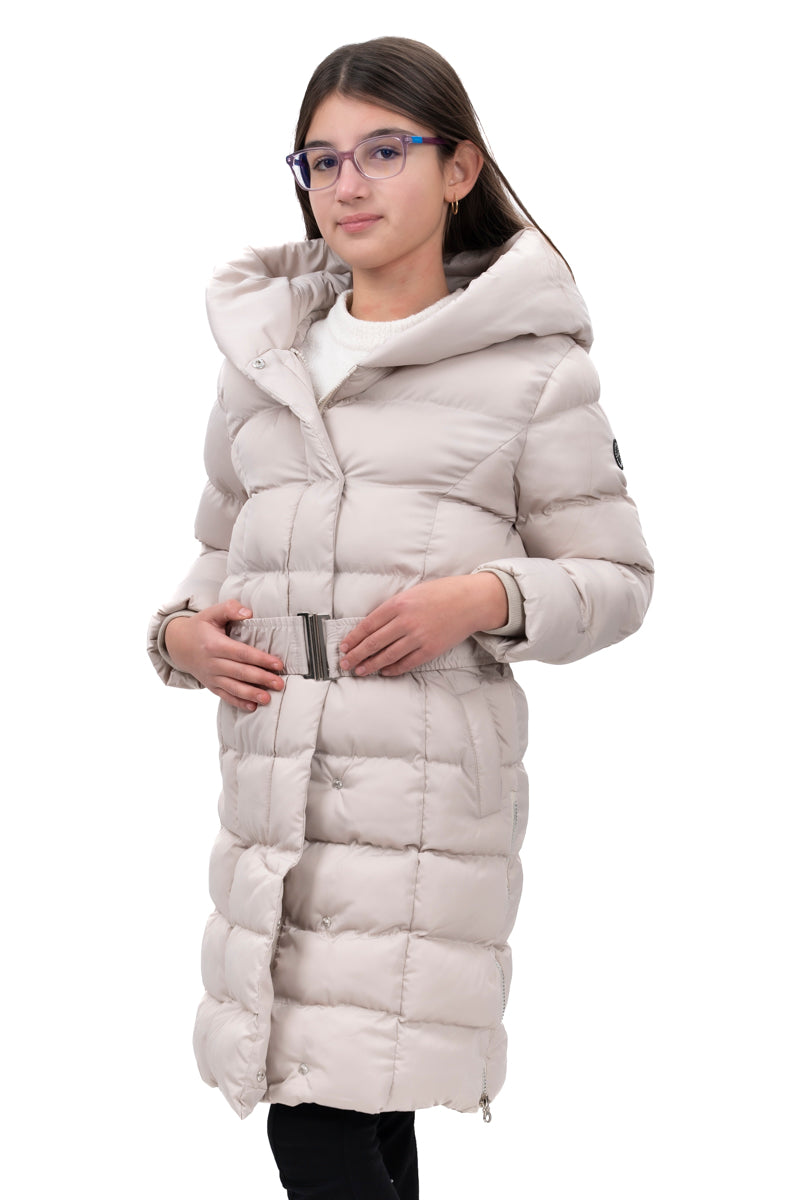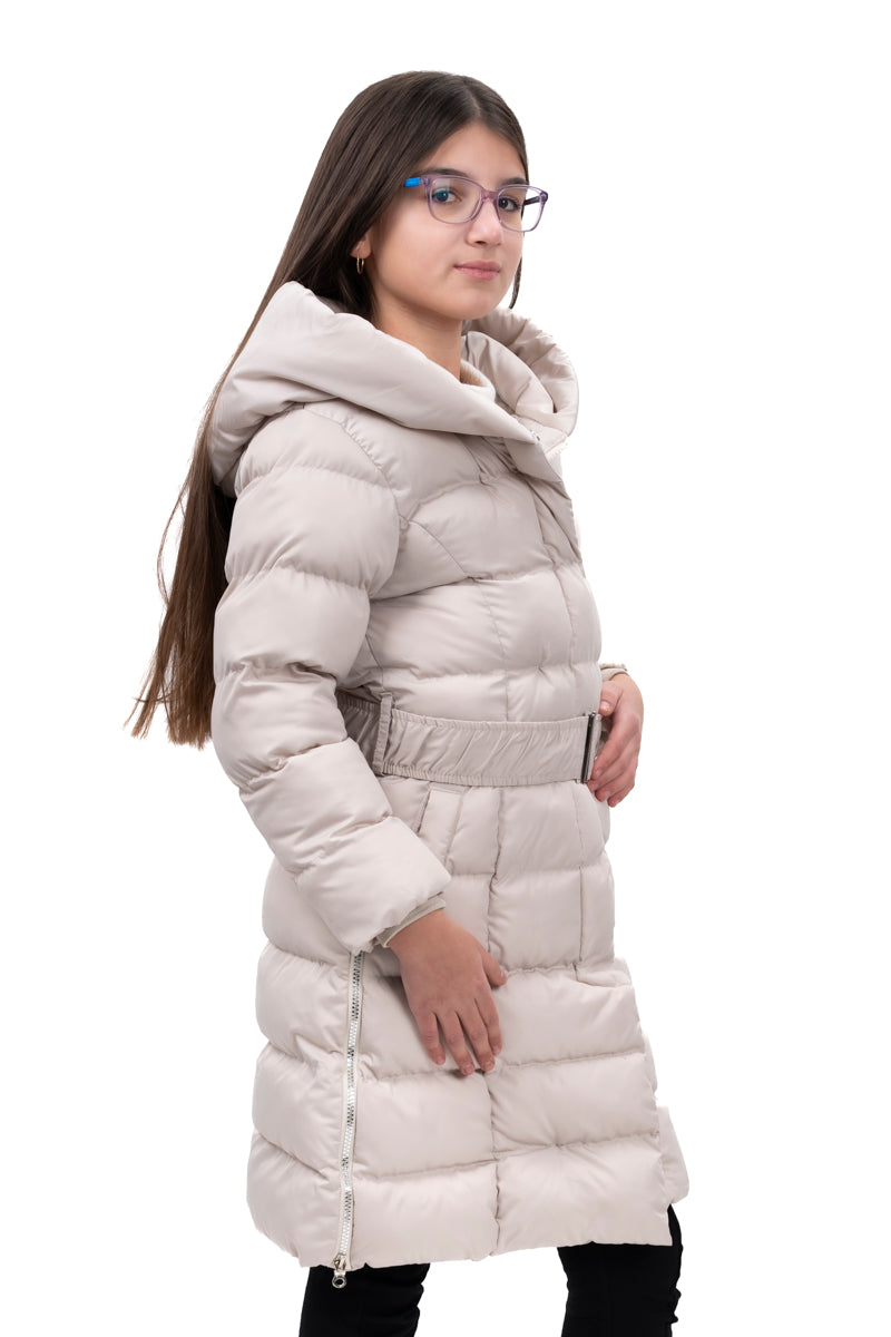 Детско яке за момиче дълго със сваляща се качулка с естествен пух и колан на талията в екрю 1418