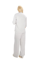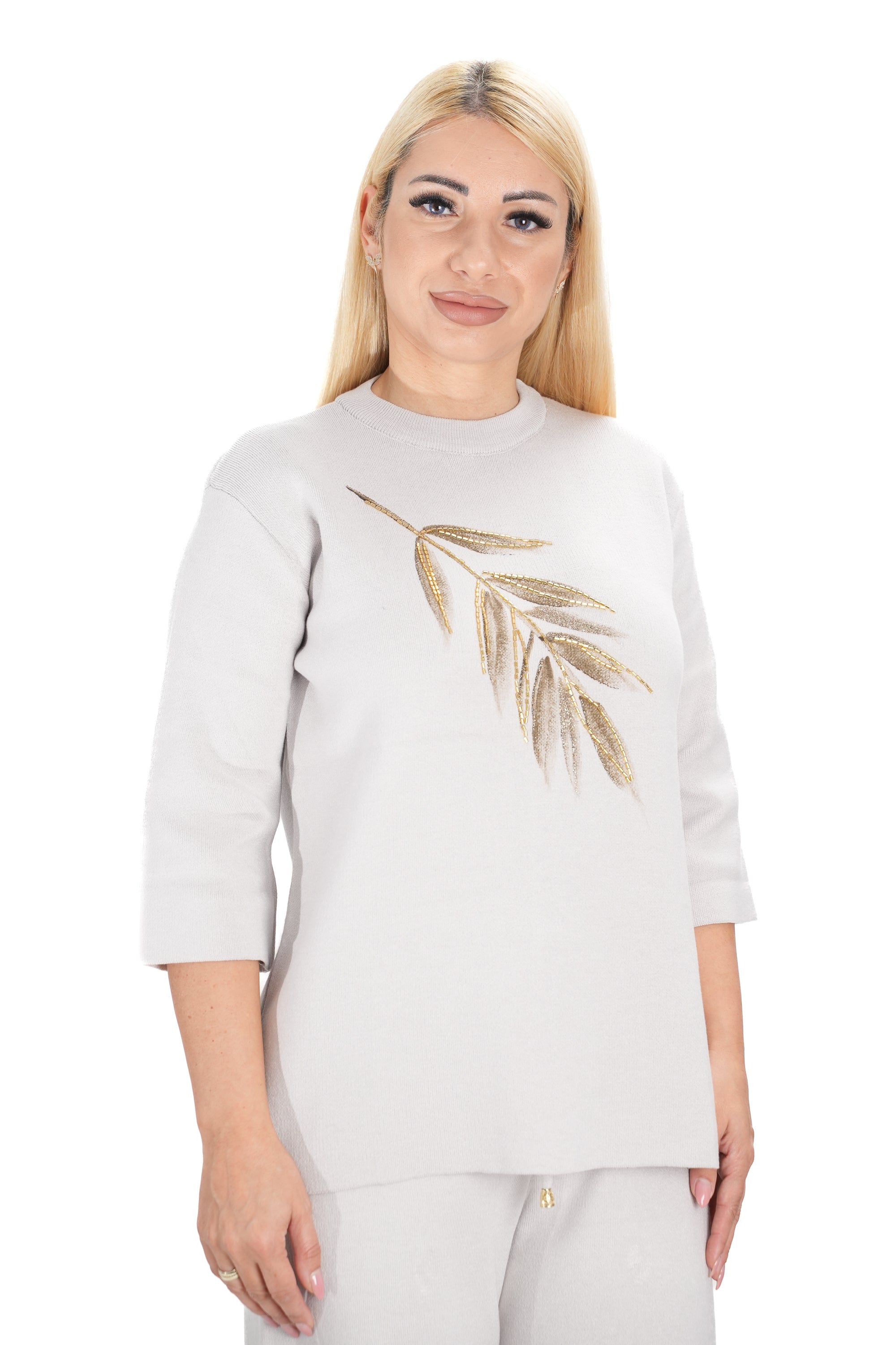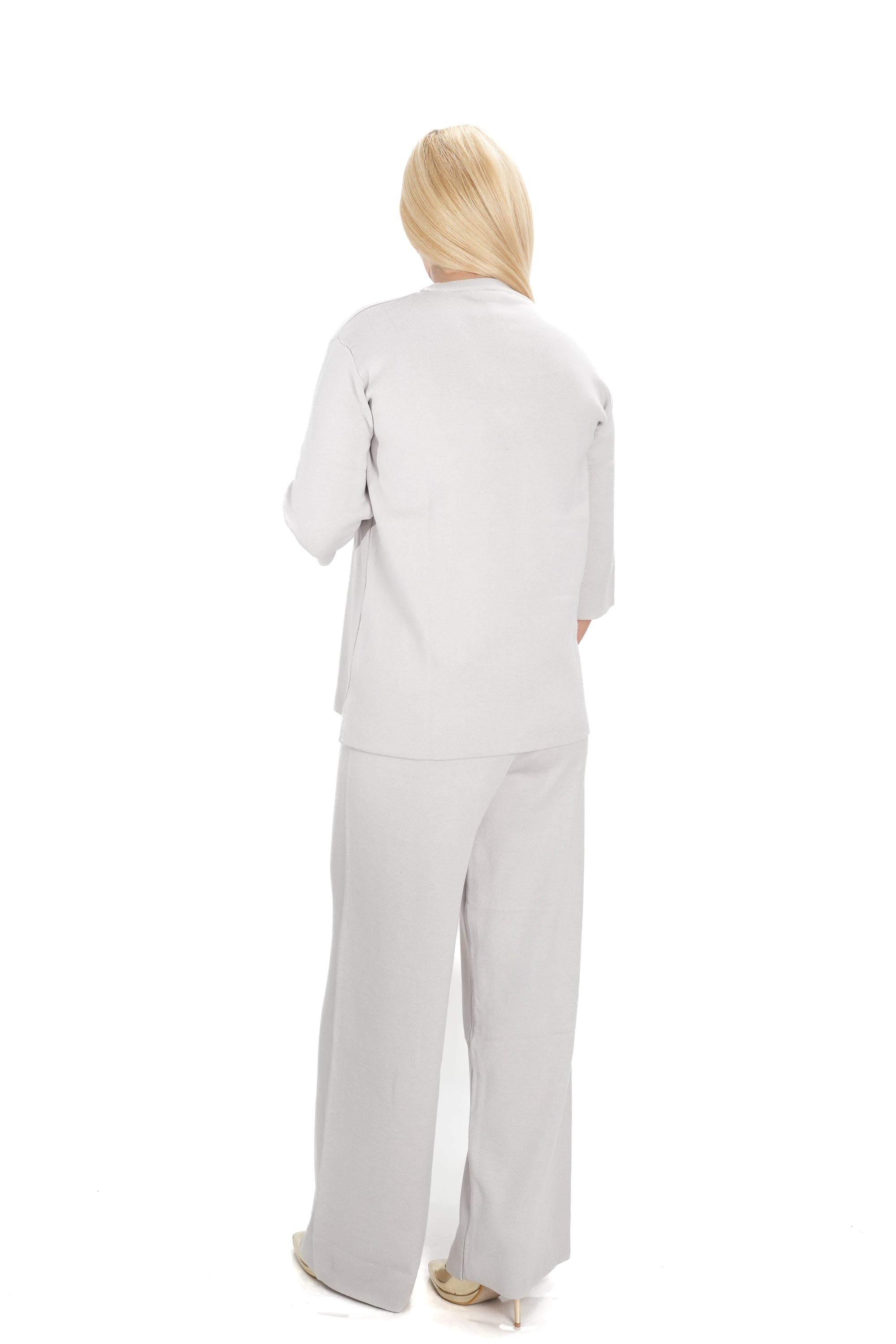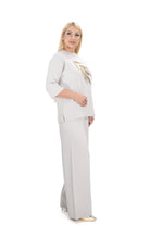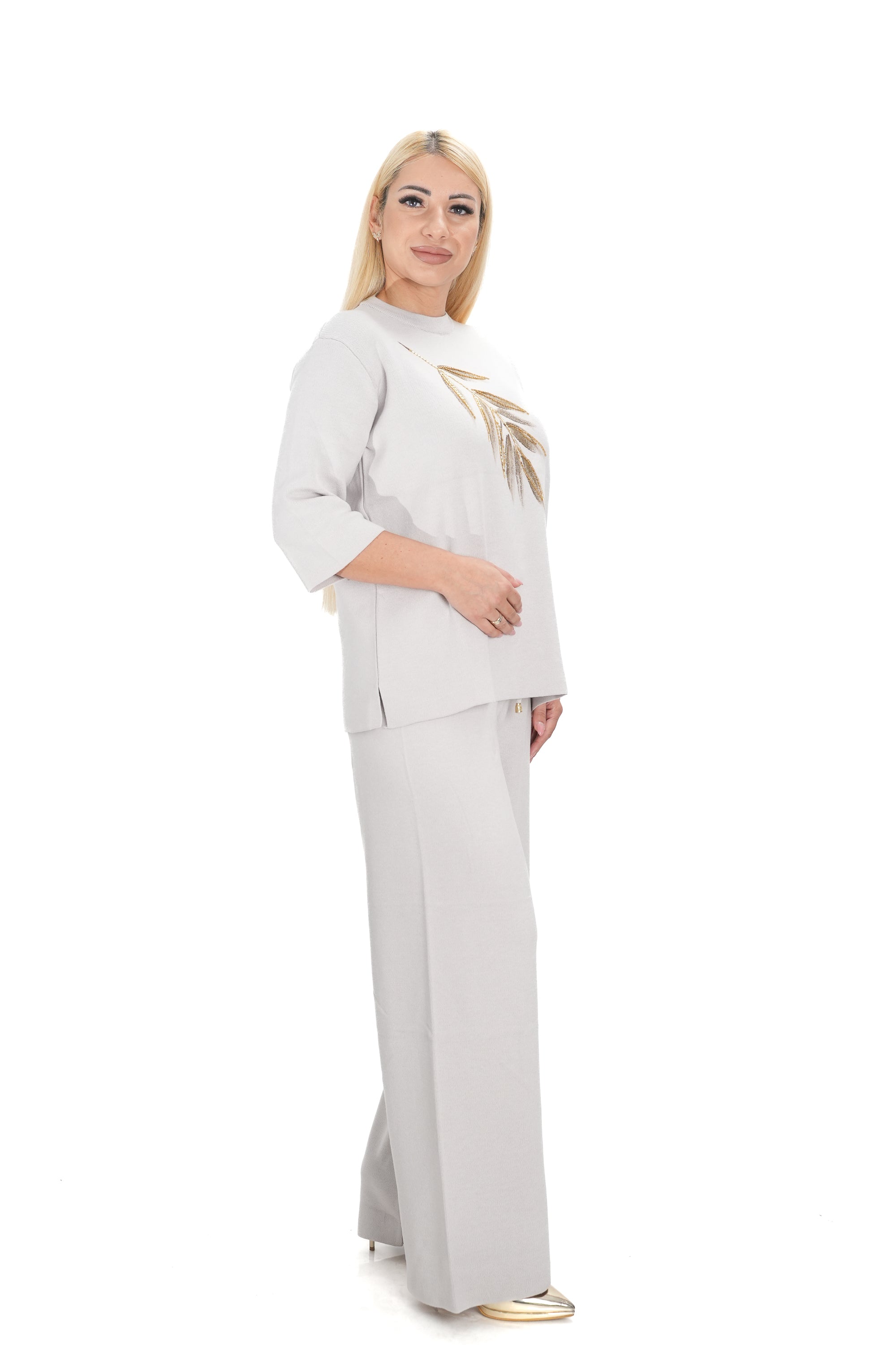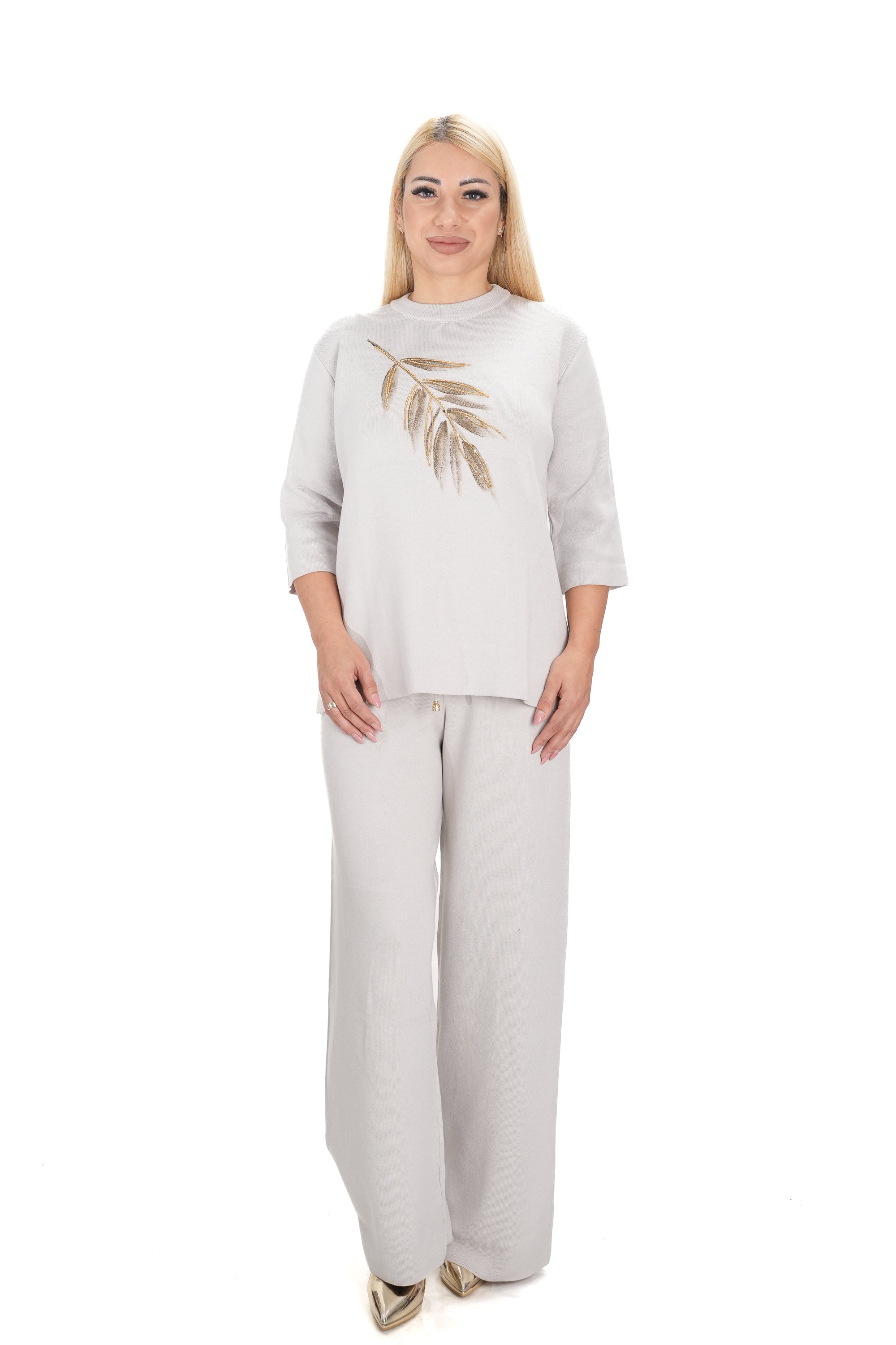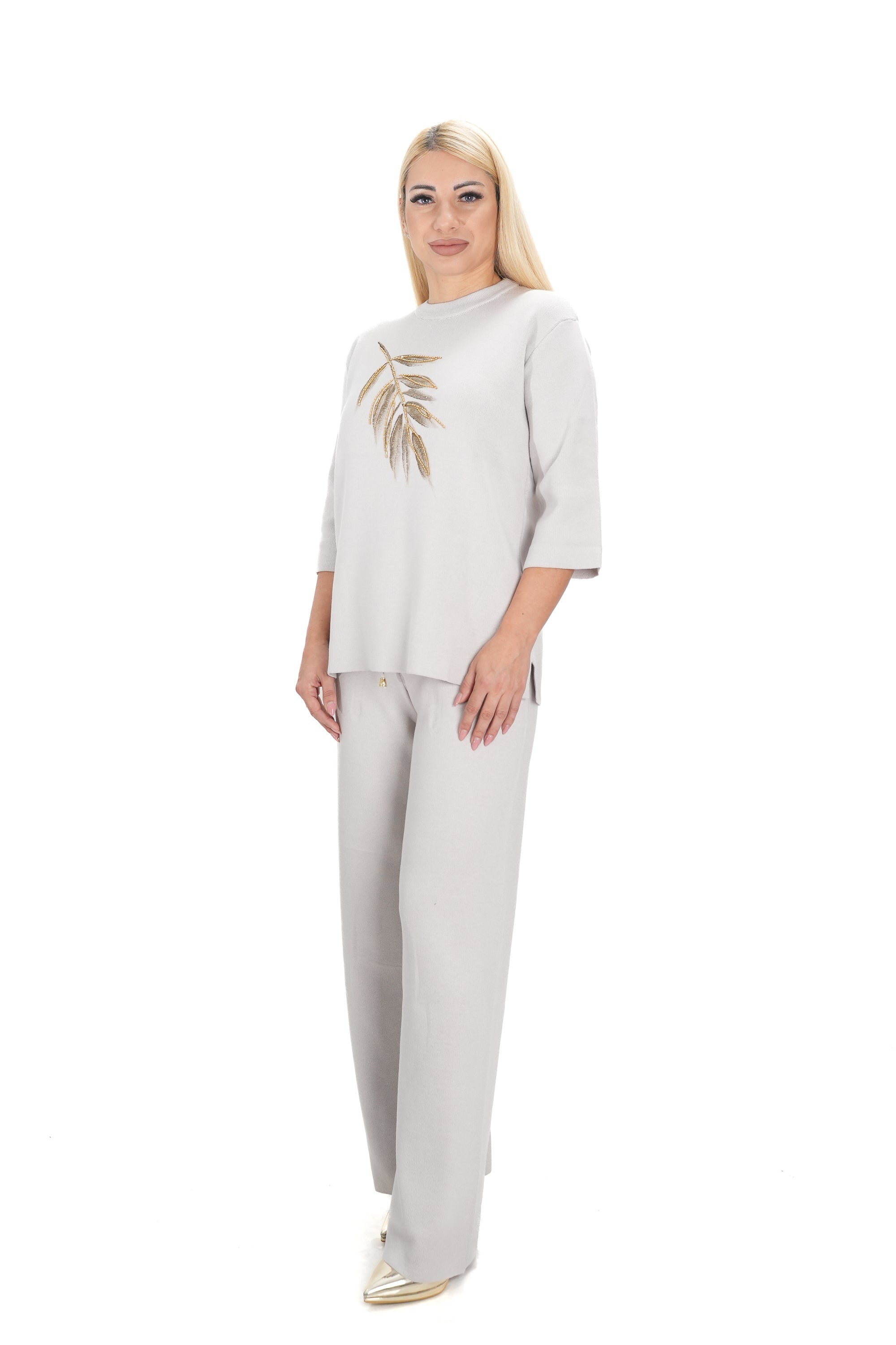 Дамски комплект от 2 части от фино плетиво с широк панталон и блуза в бежово с 3/4 ръкав 15201