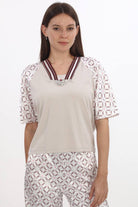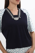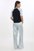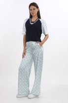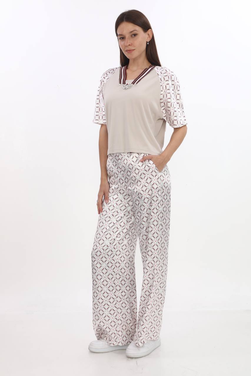 Дамски комплект от 2 части спортен с широк панталон от сатен и блуза с къс ръкав в синьо 37655-001