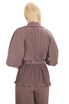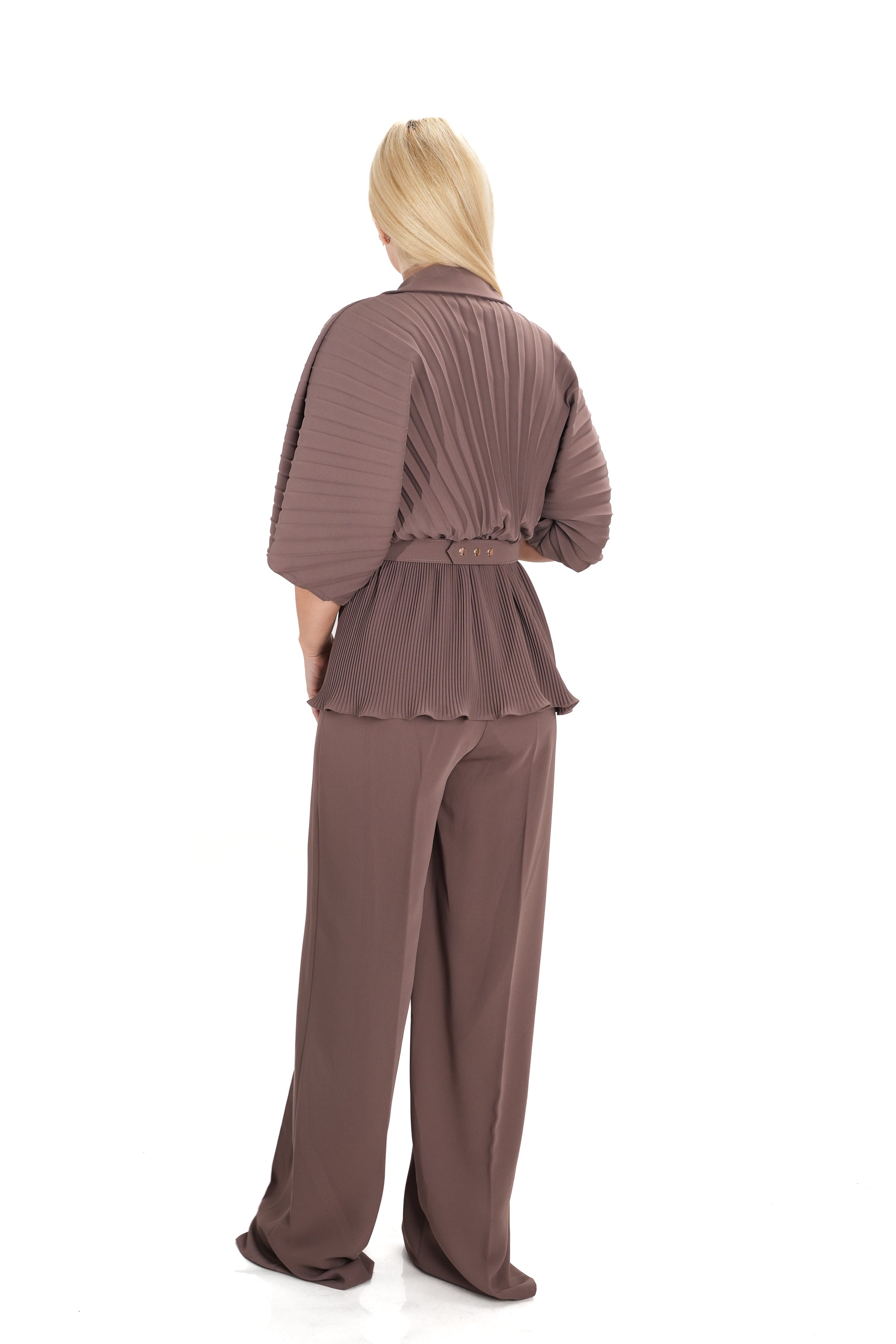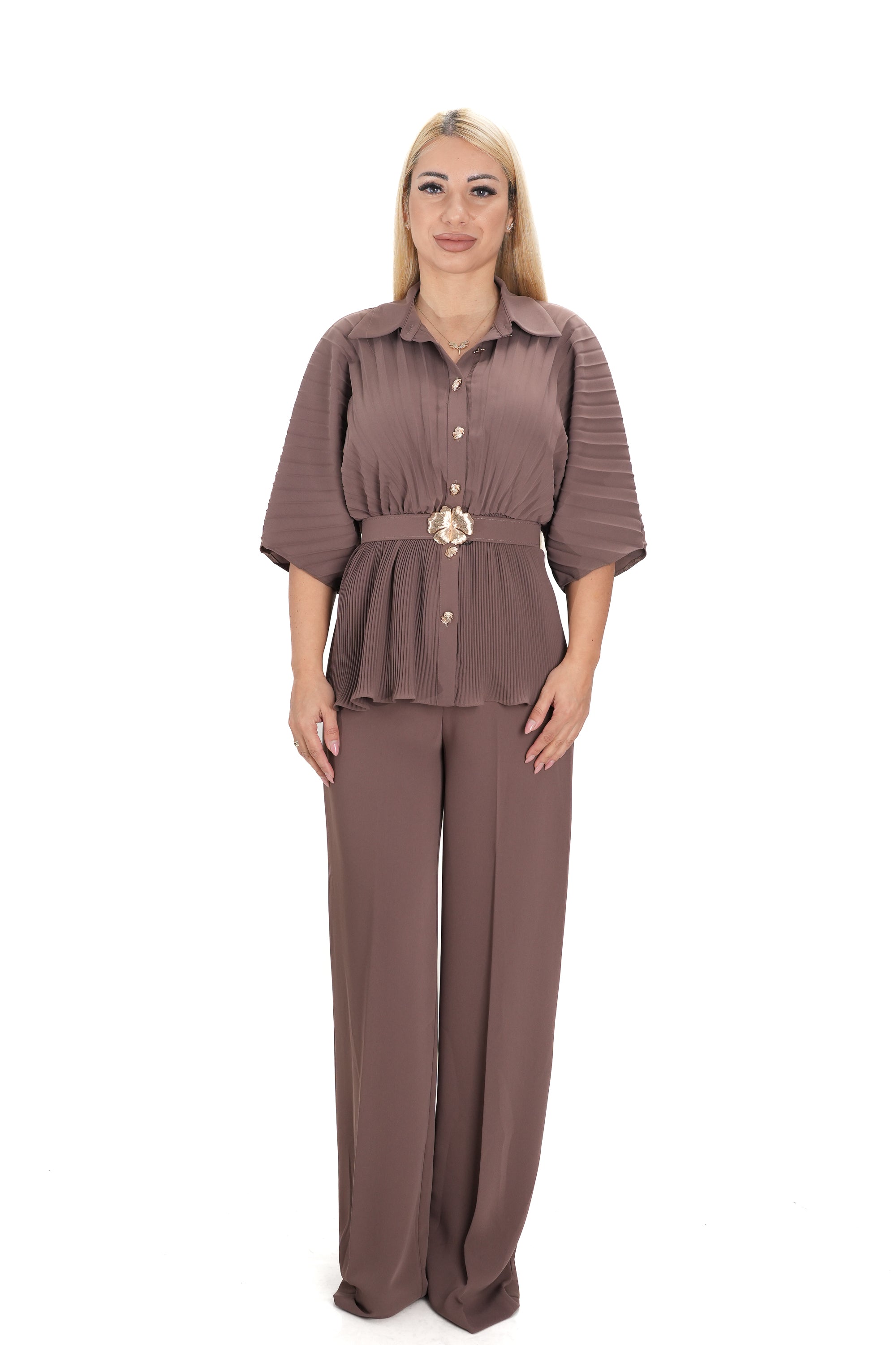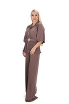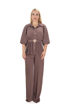 Дамски комплект от 2 части с широк панталон с висока талия и риза солей с колан на талията в кафяво цвят кафе 24201