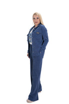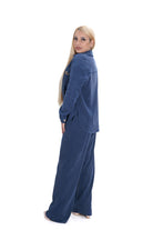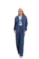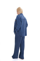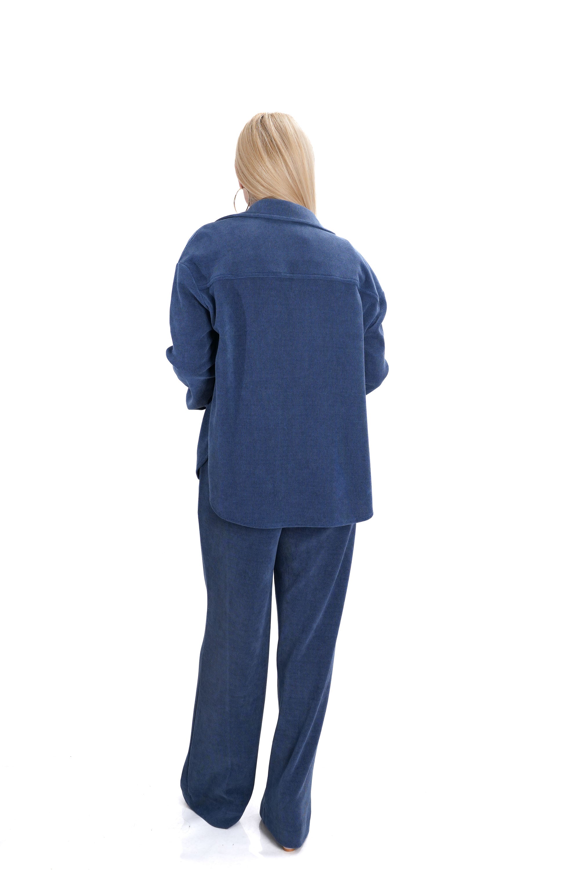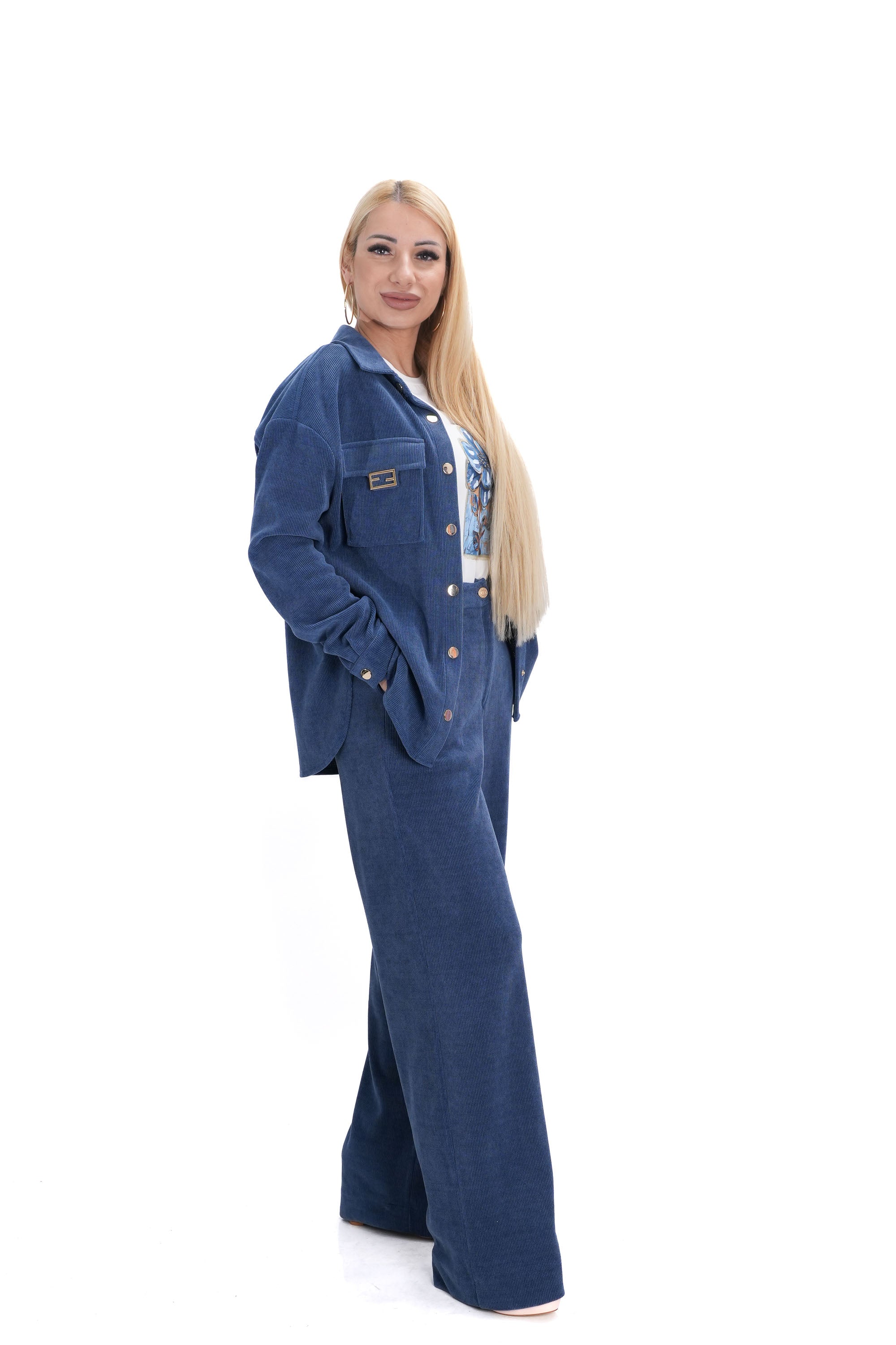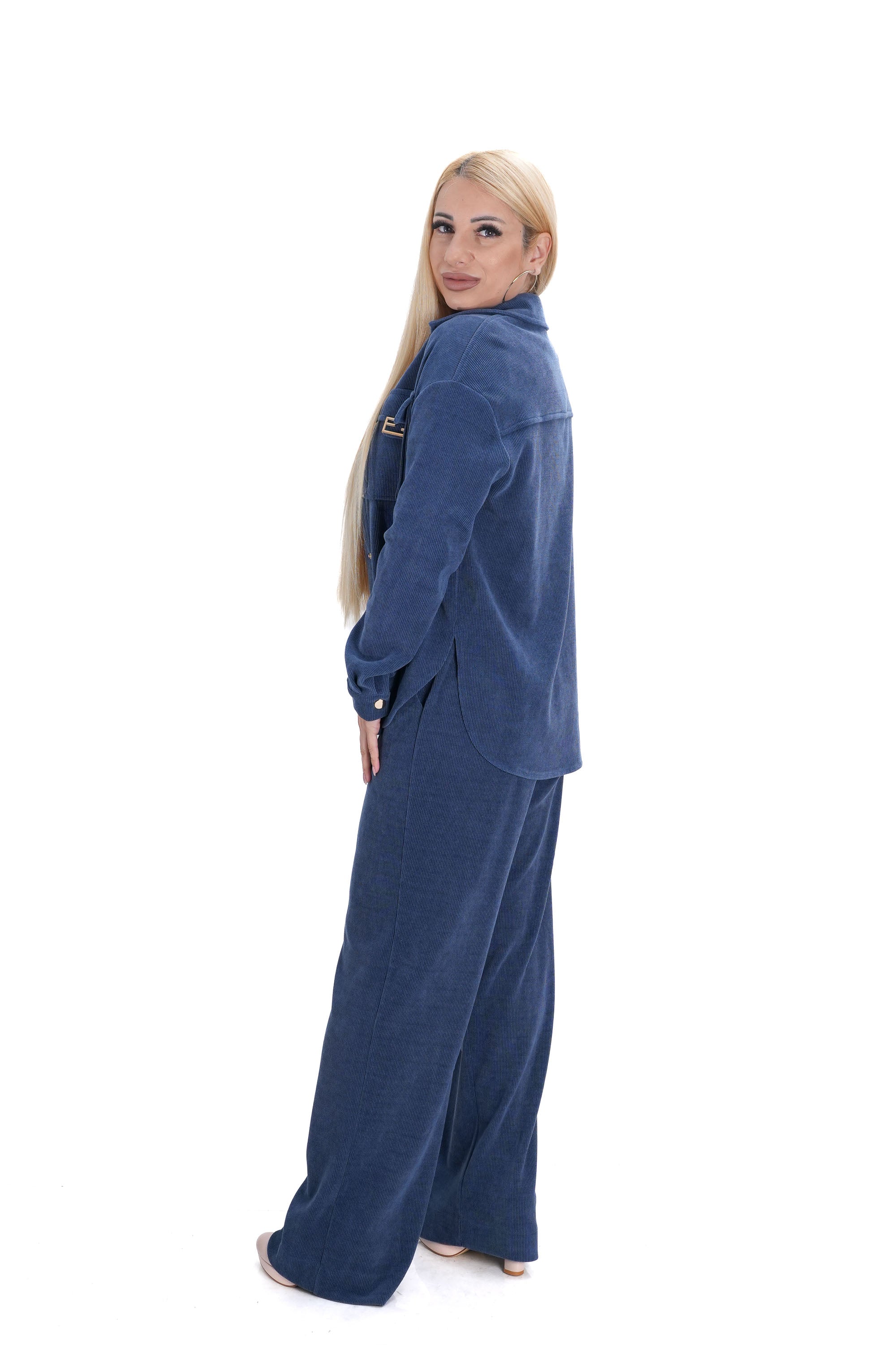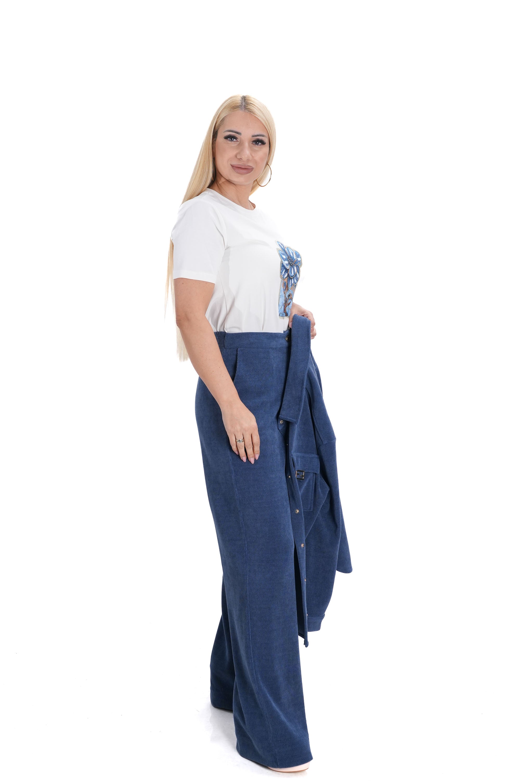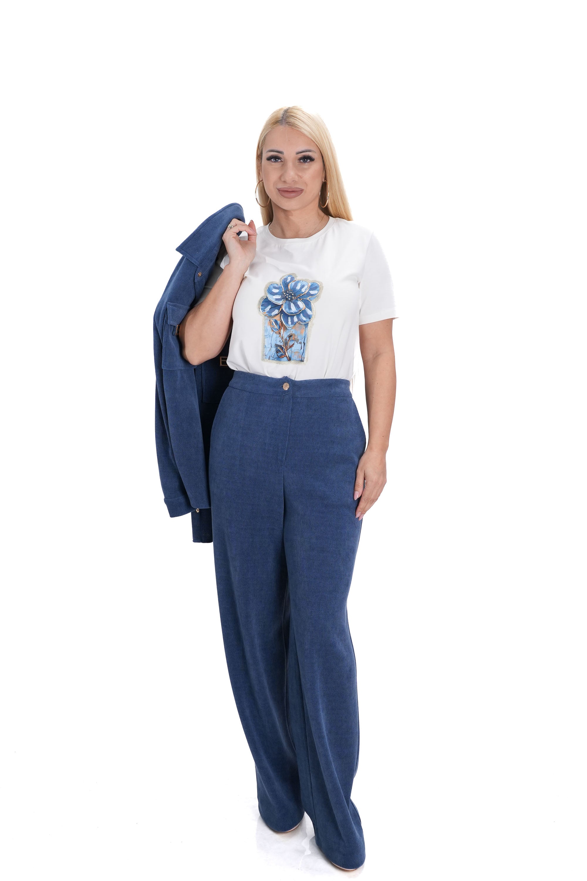 Дамски комплект от 3 части ежедневен с широк панталон тениска и връхна риза тип джинсов плат еластичен в синьо 2258045
