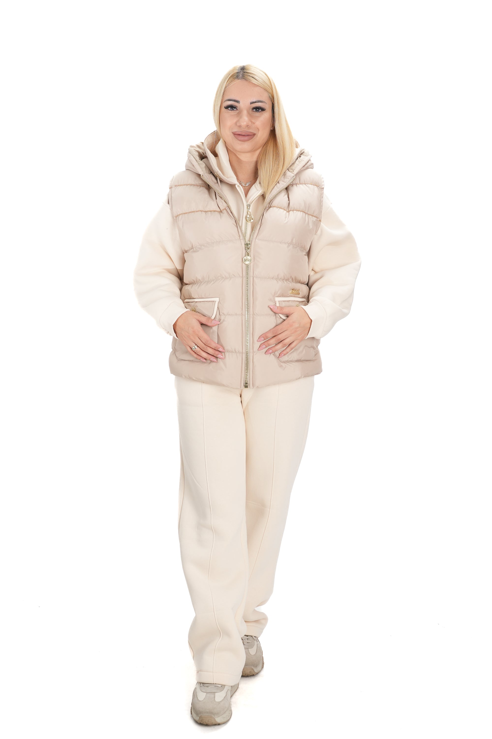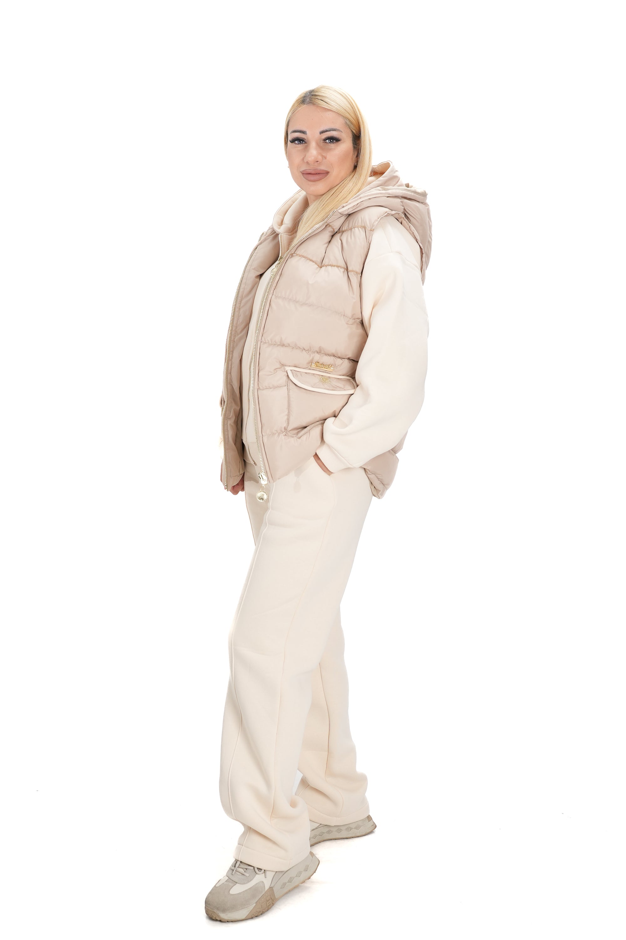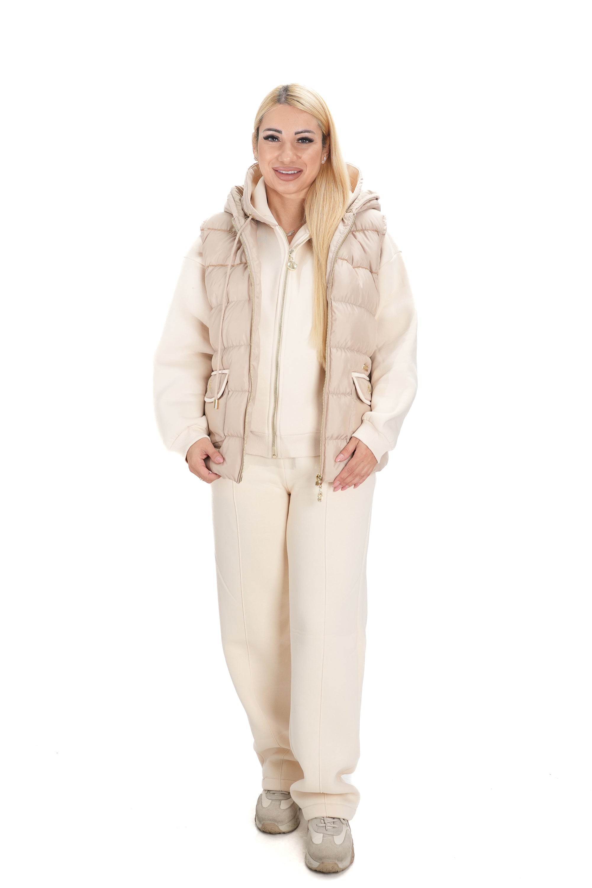 Дамски комплект от 3 части спортен ватиран в кремав цвят с бежов елек с качулка 37871-002
