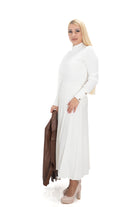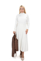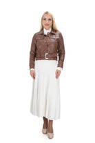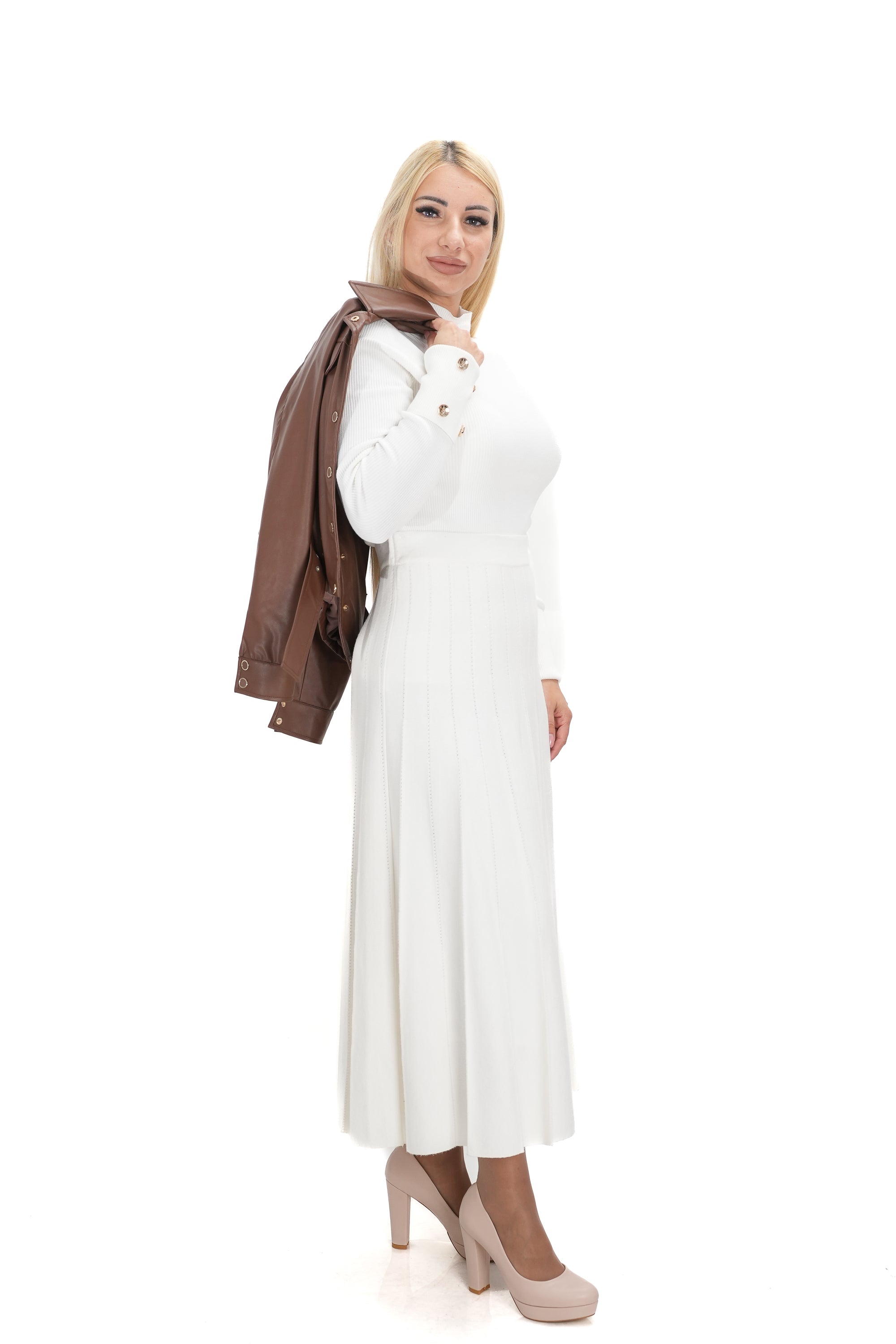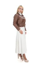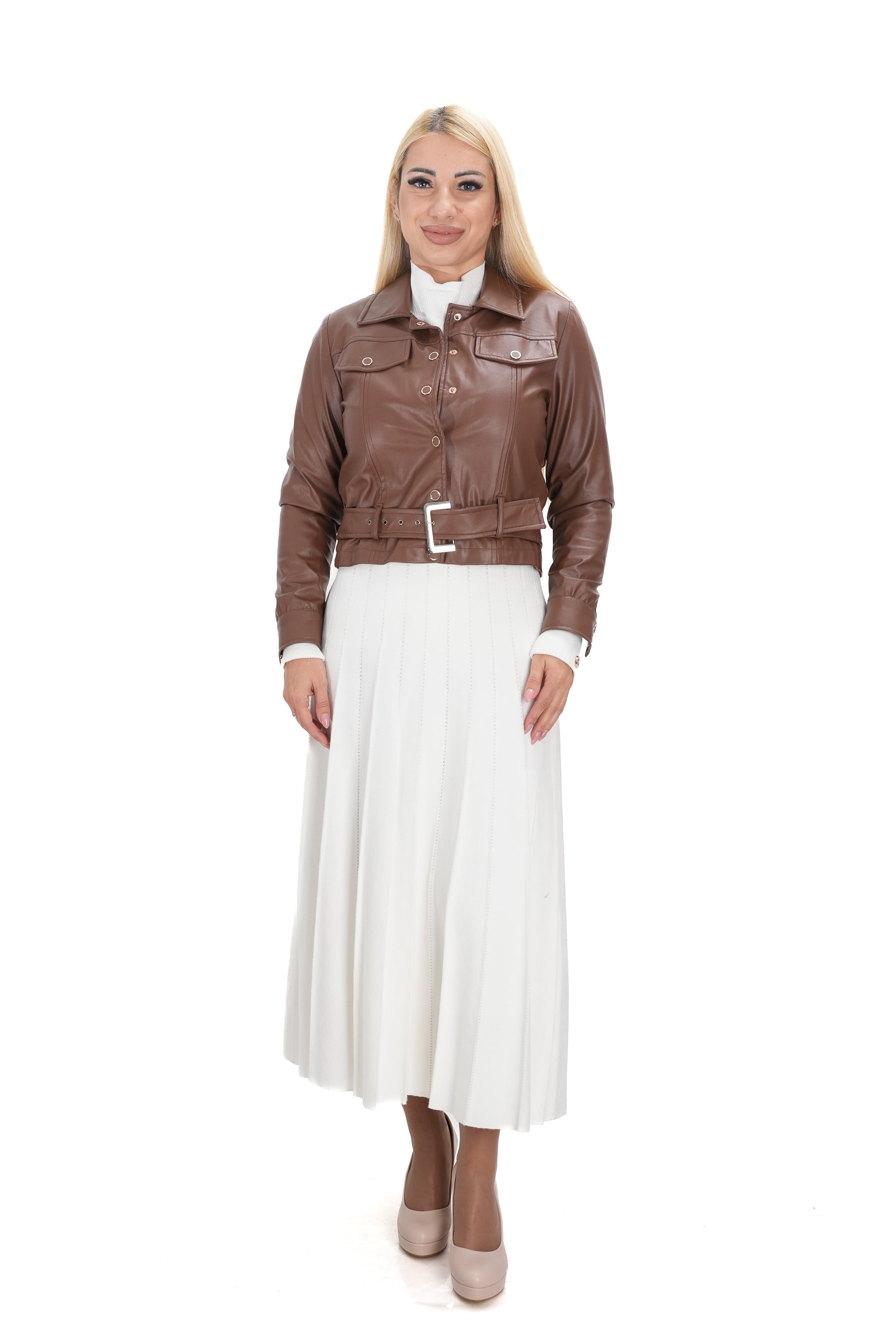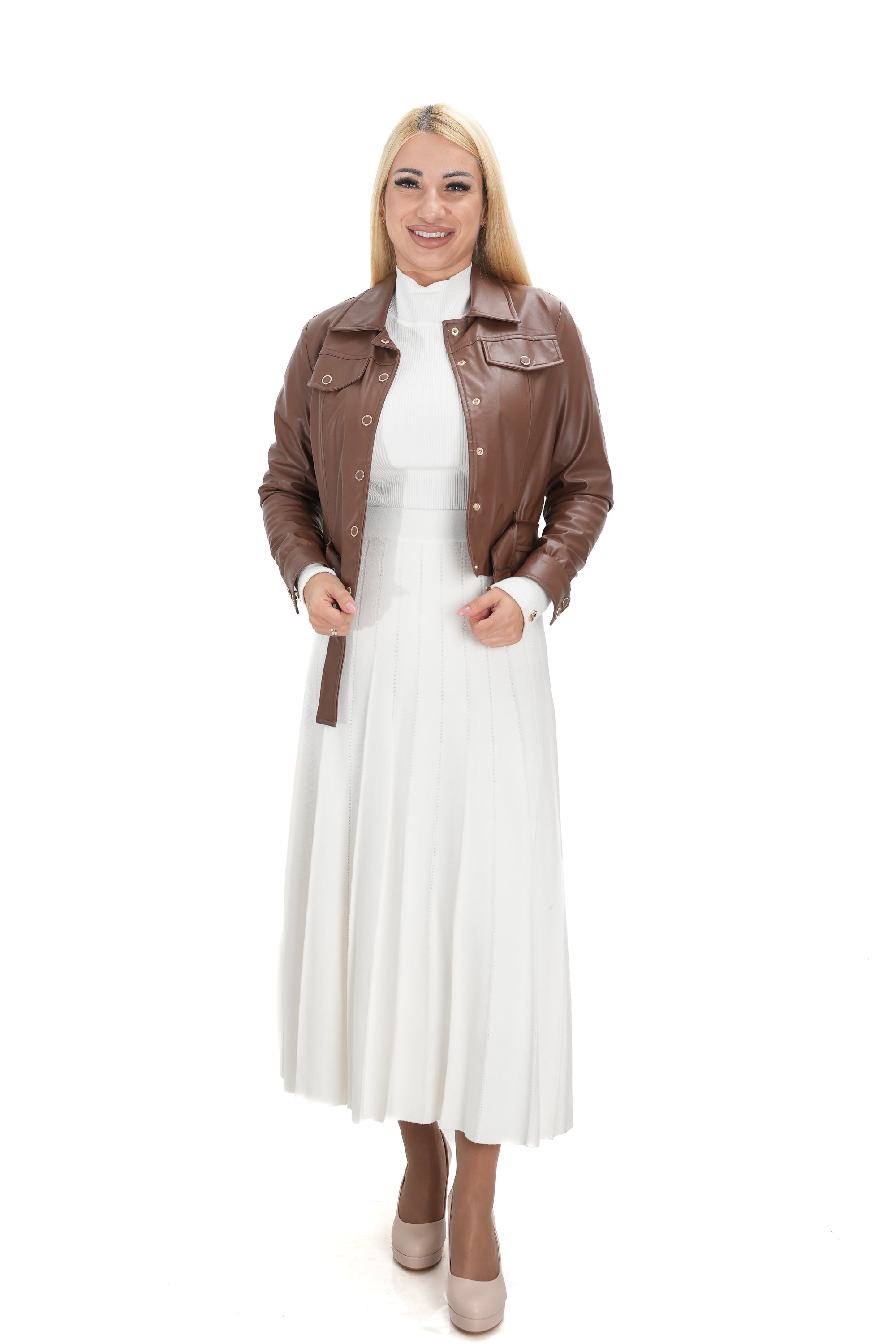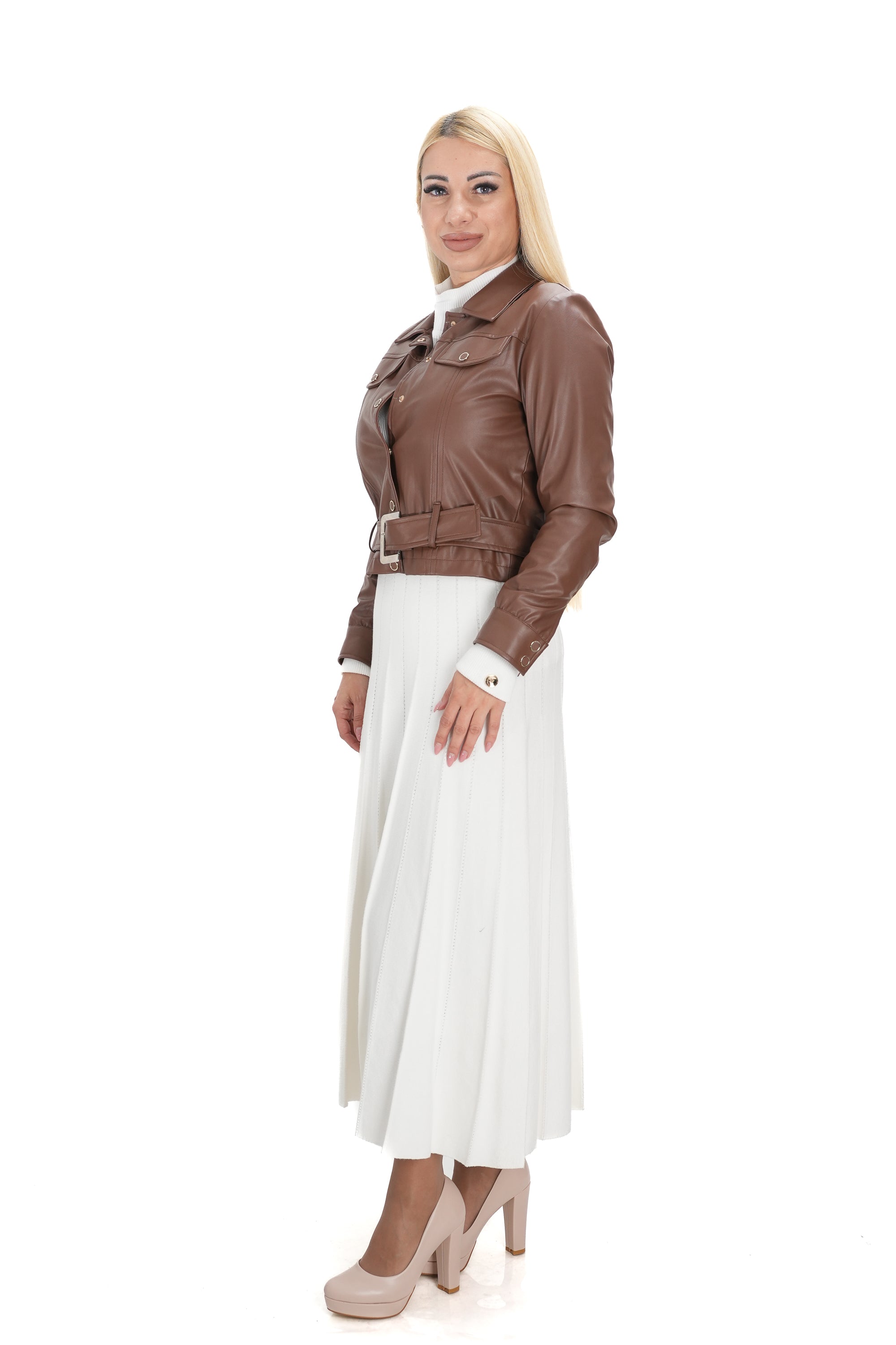 Дамски комплект от 3 части с кафяво кожено яке + блуза с поло яка и дълга пола от фино плетиво в бяло 7294