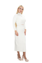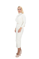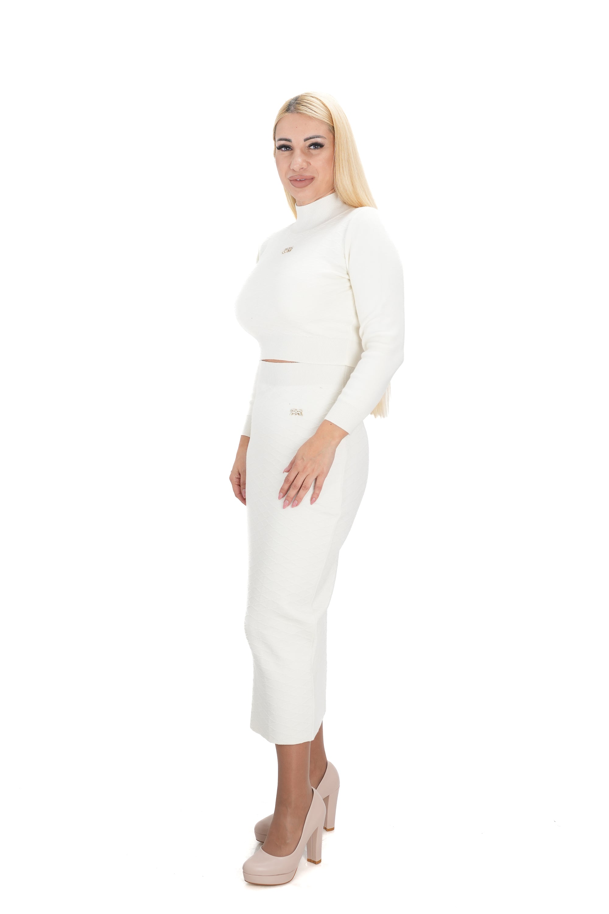 Дамски комплект спортно-елегантен от 2 части с дълга пола и къс топ от фино плетиво в екрю 5050
