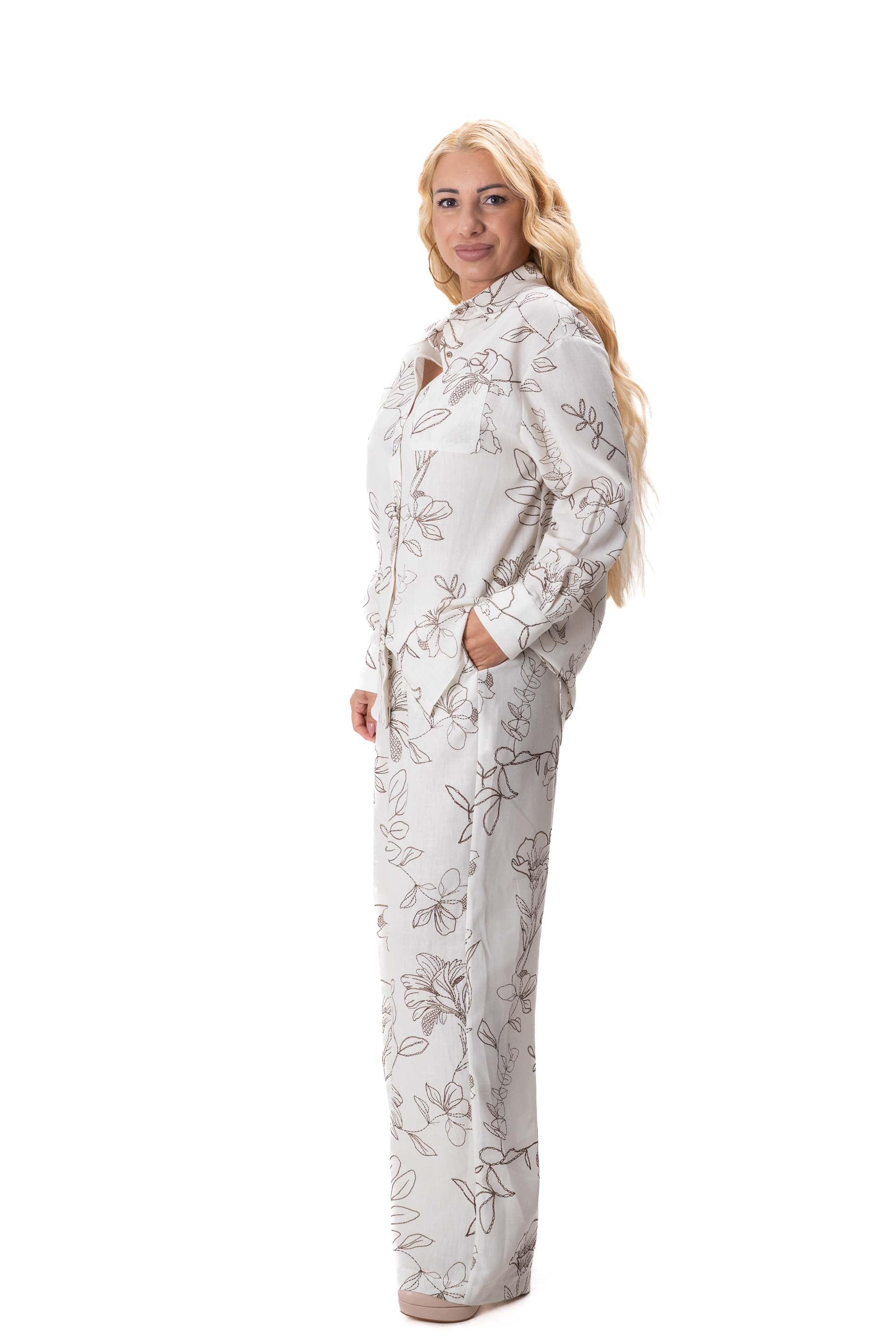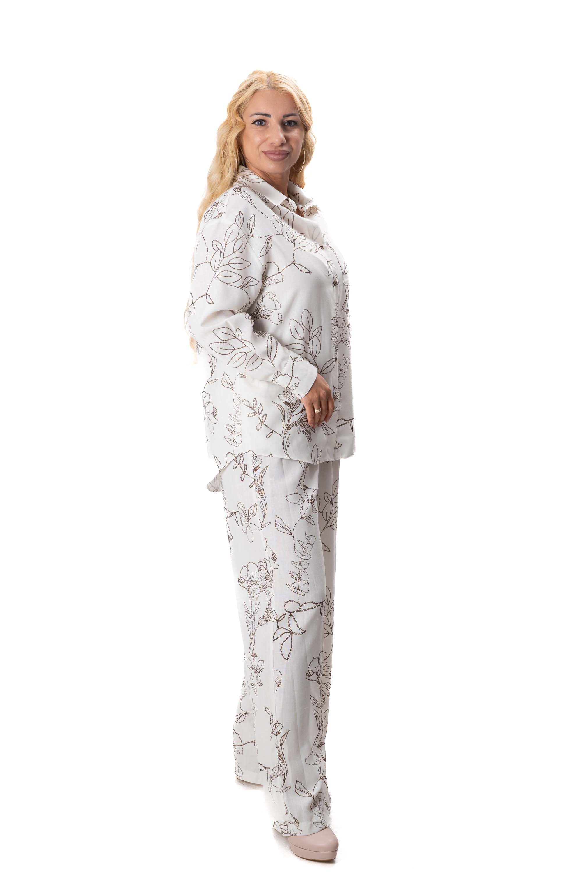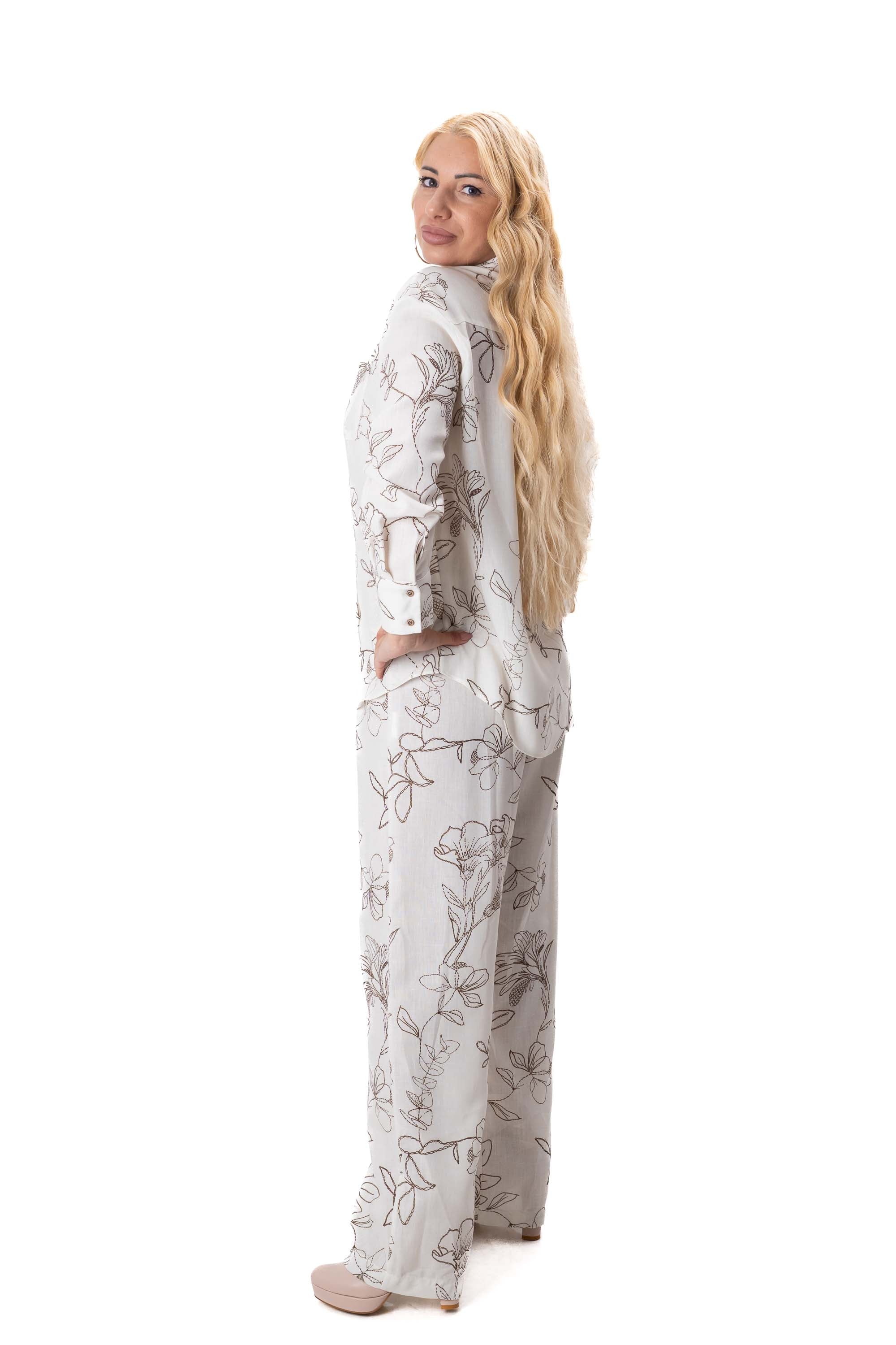 Комплектът включва свободна риза с модерна и непринудена кройка и широк панталон, който оформя елегантна и издължена линия на силуета. Свободният дизайн осигурява комфорт през целия ден и позволява на дрехата да пада красиво по тялото.
