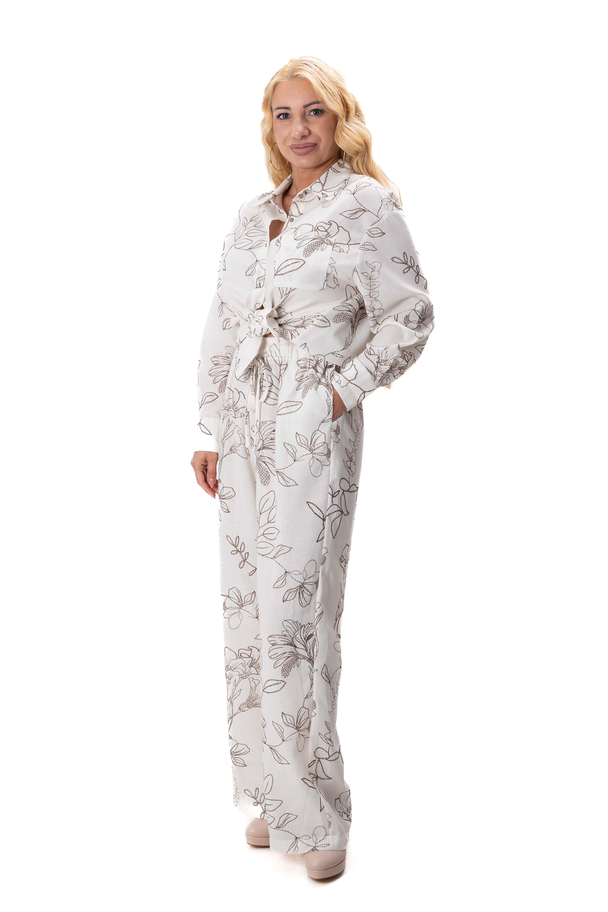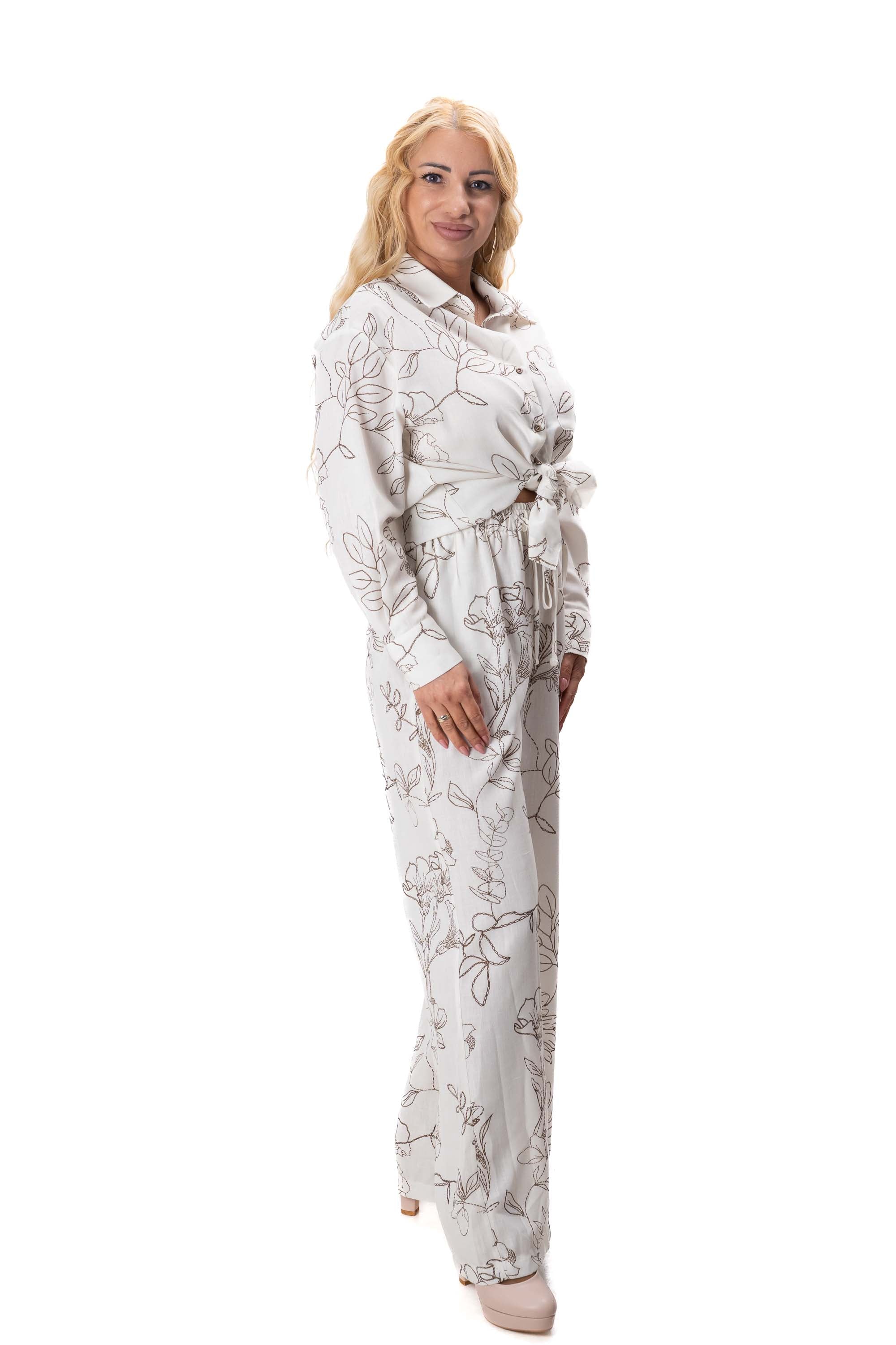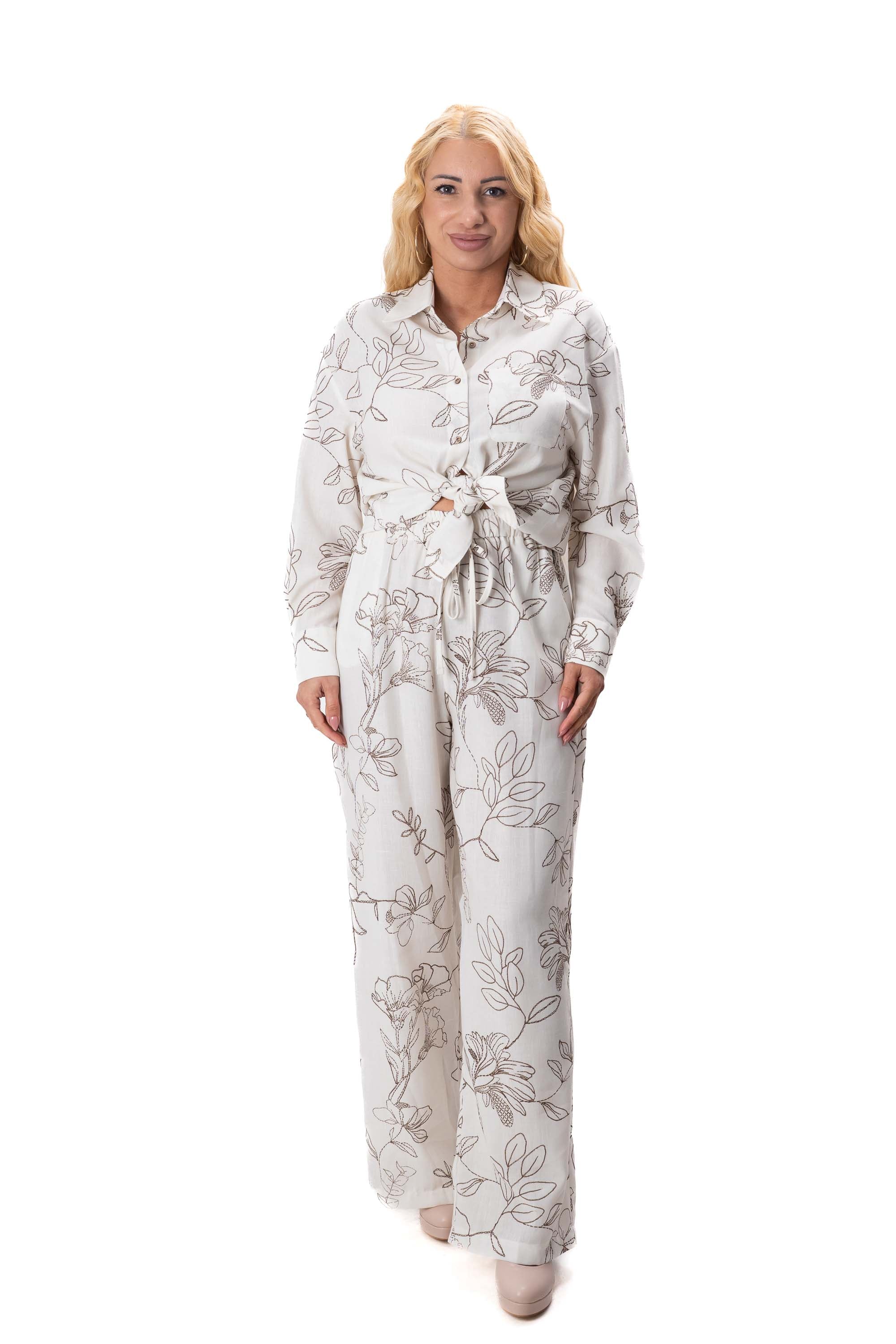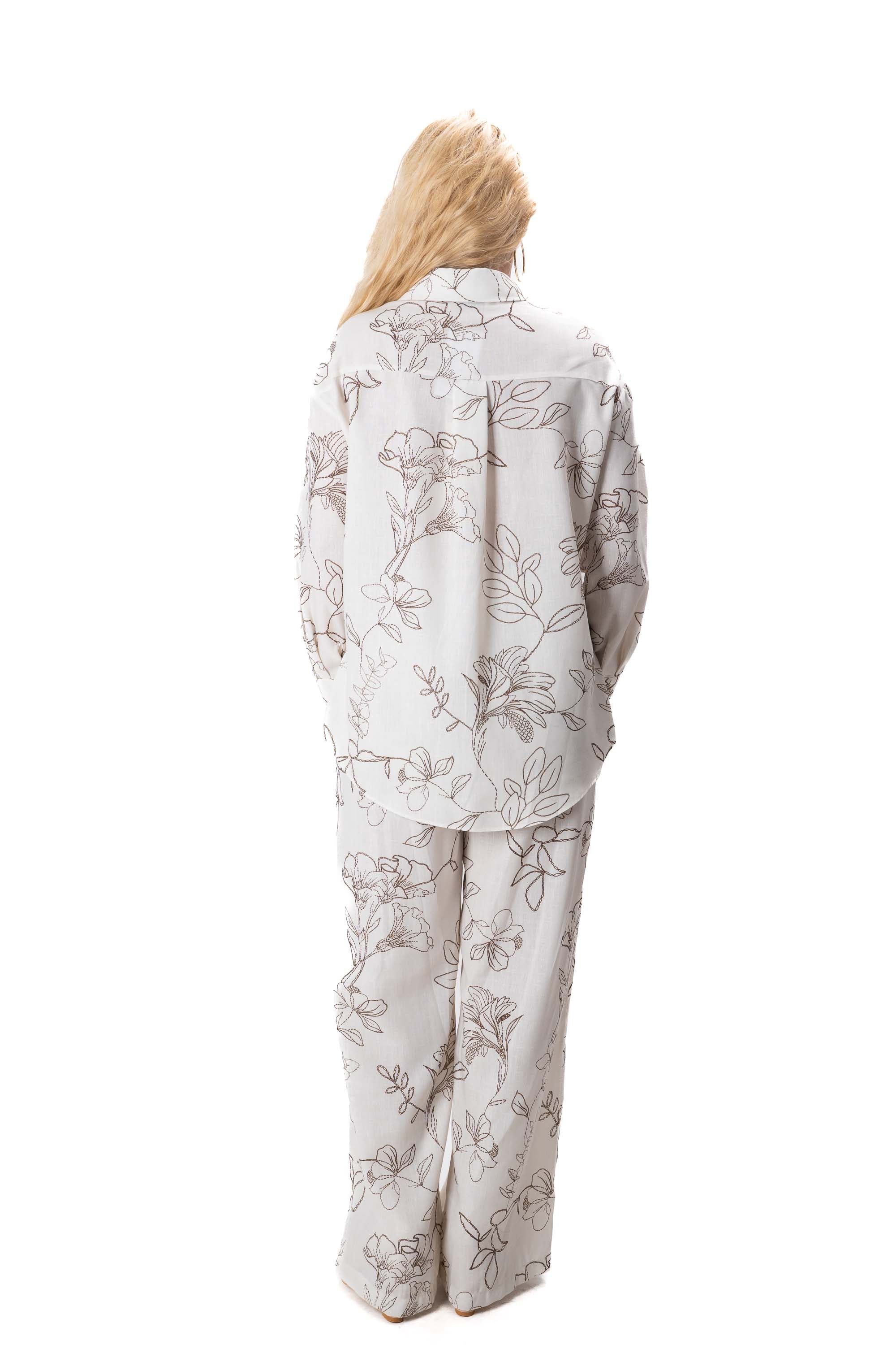 Комплектът включва свободна риза с модерна и непринудена кройка и широк панталон, който оформя елегантна и издължена линия на силуета. Свободният дизайн осигурява комфорт през целия ден и позволява на дрехата да пада красиво по тялото.