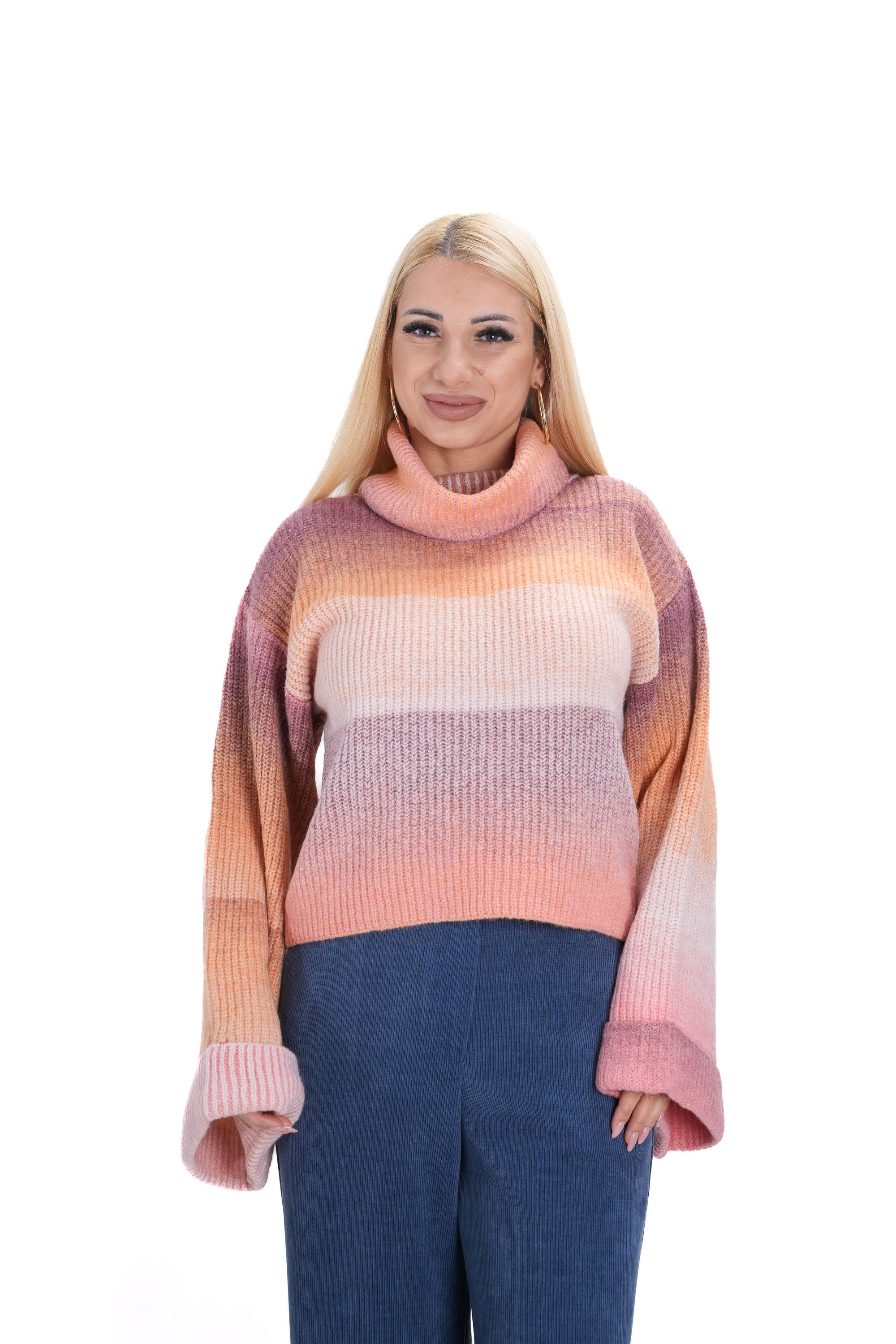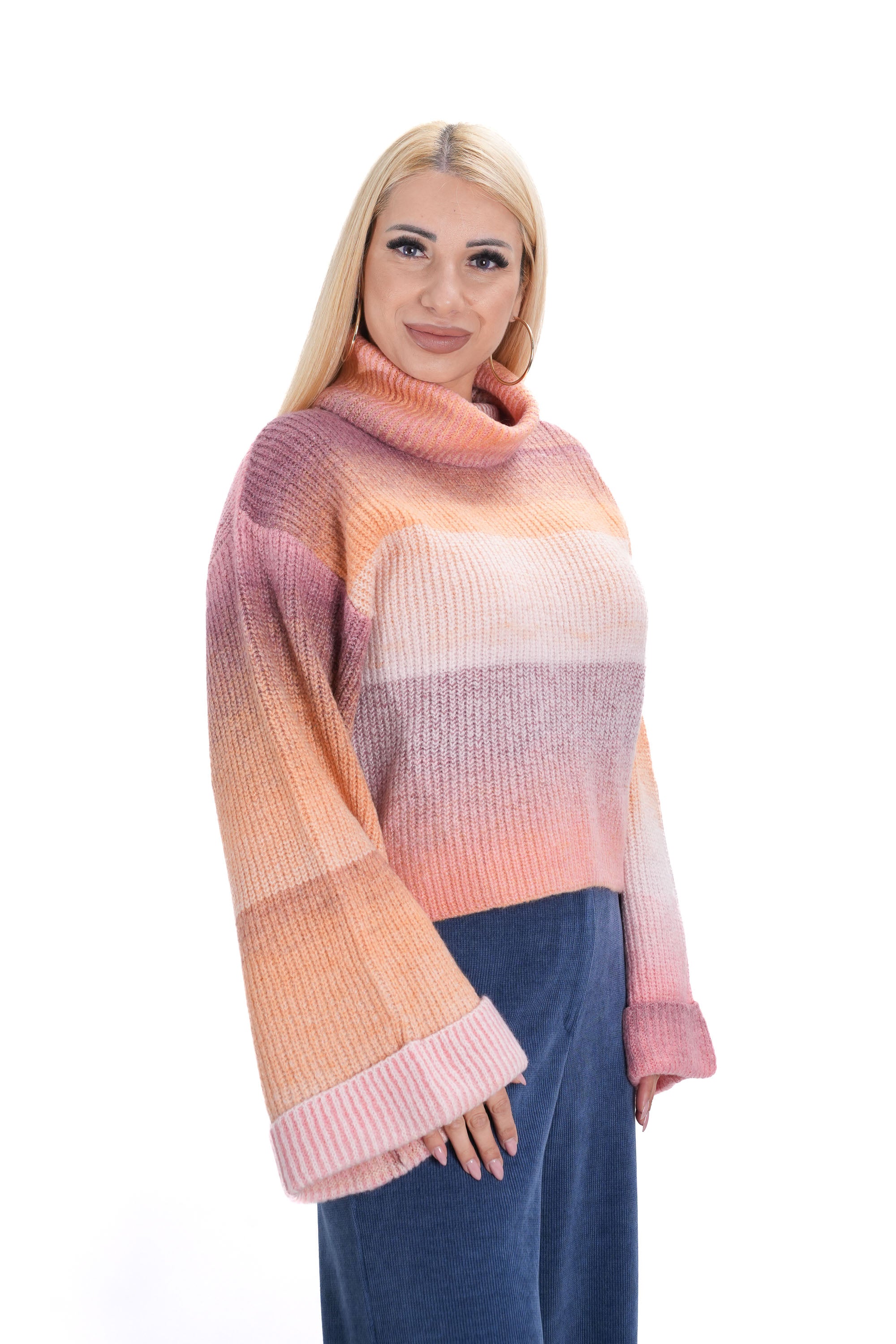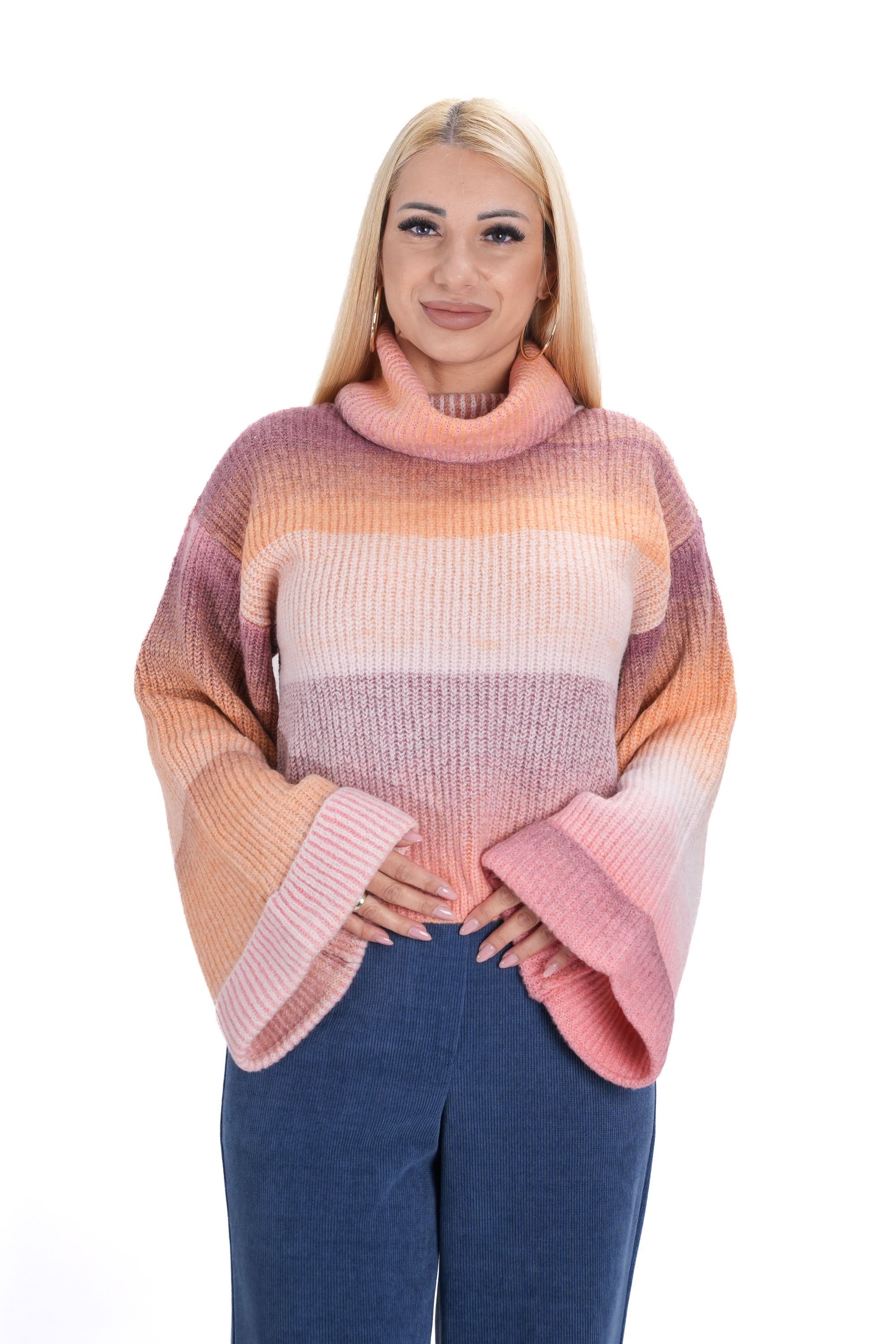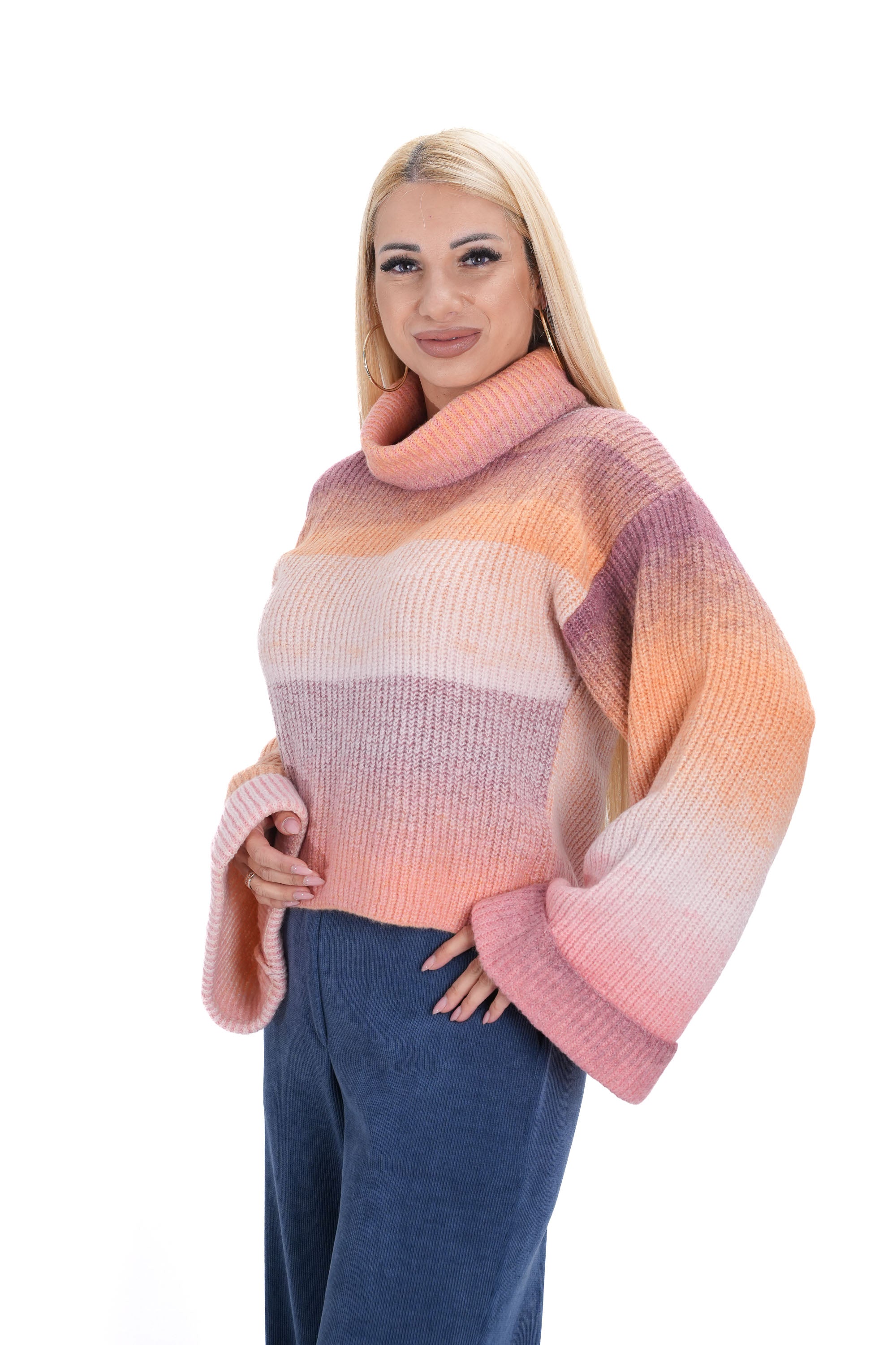Мек дамски пуловер от плетиво с поло яка и широки ръкави в нежни преливащи розови цветове. Идеален за стилни и уютни визии през студените дни.