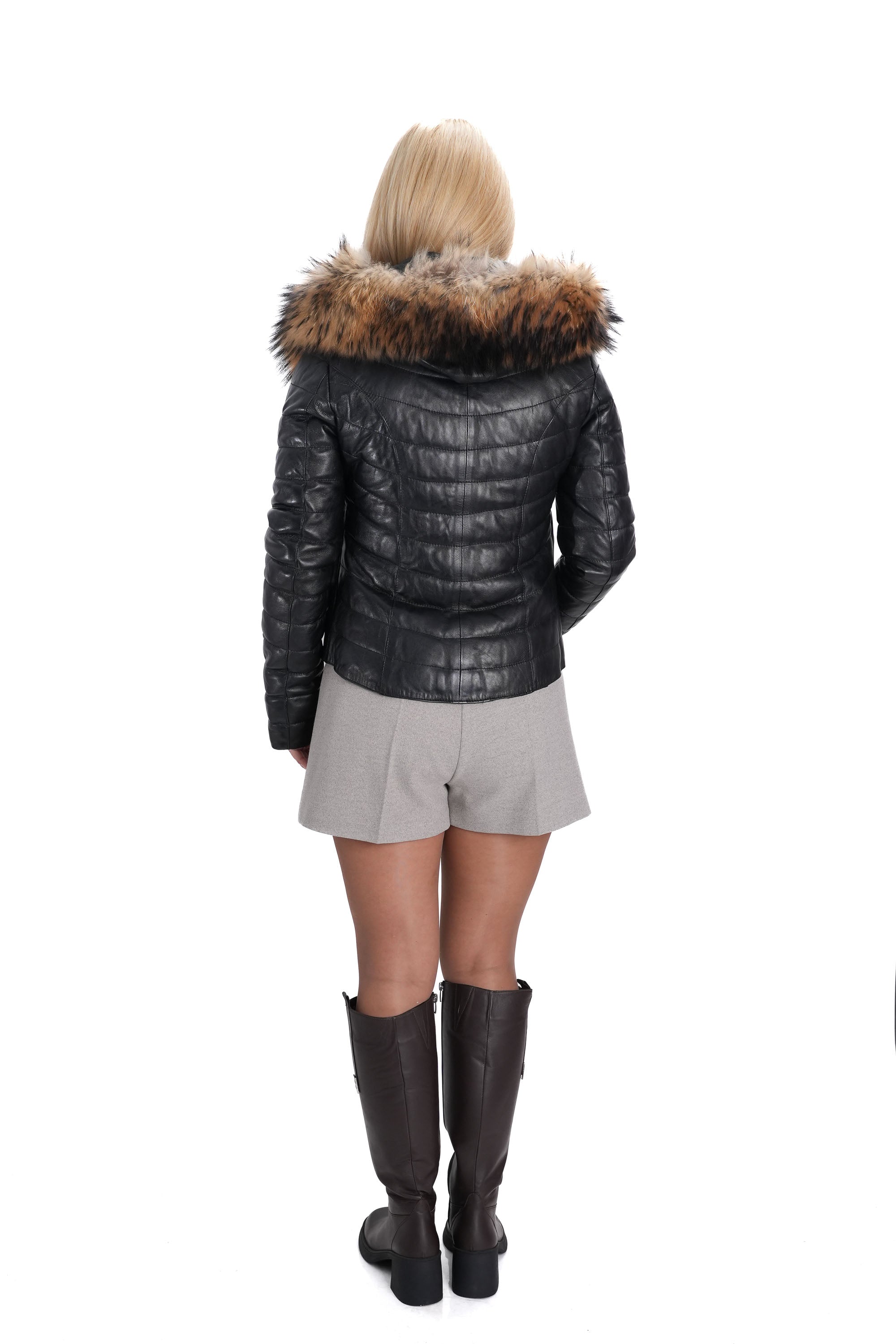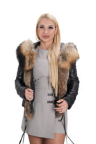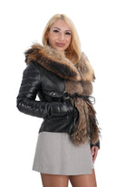 Дамско яке от естествена кожа в черно и богата яка от естествен косъм на качулката и отпред на ципа в натурален кафяв цвят K-106
