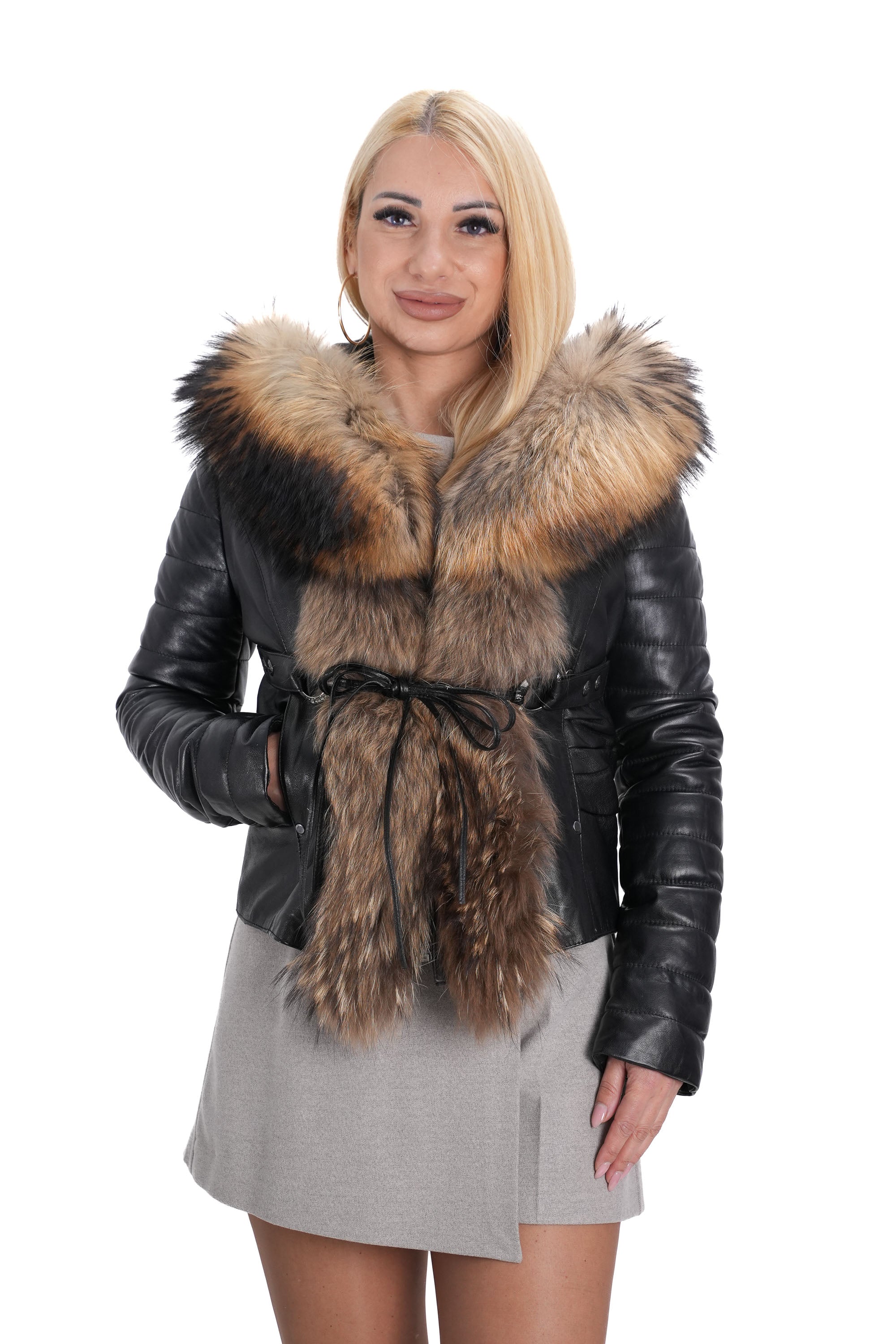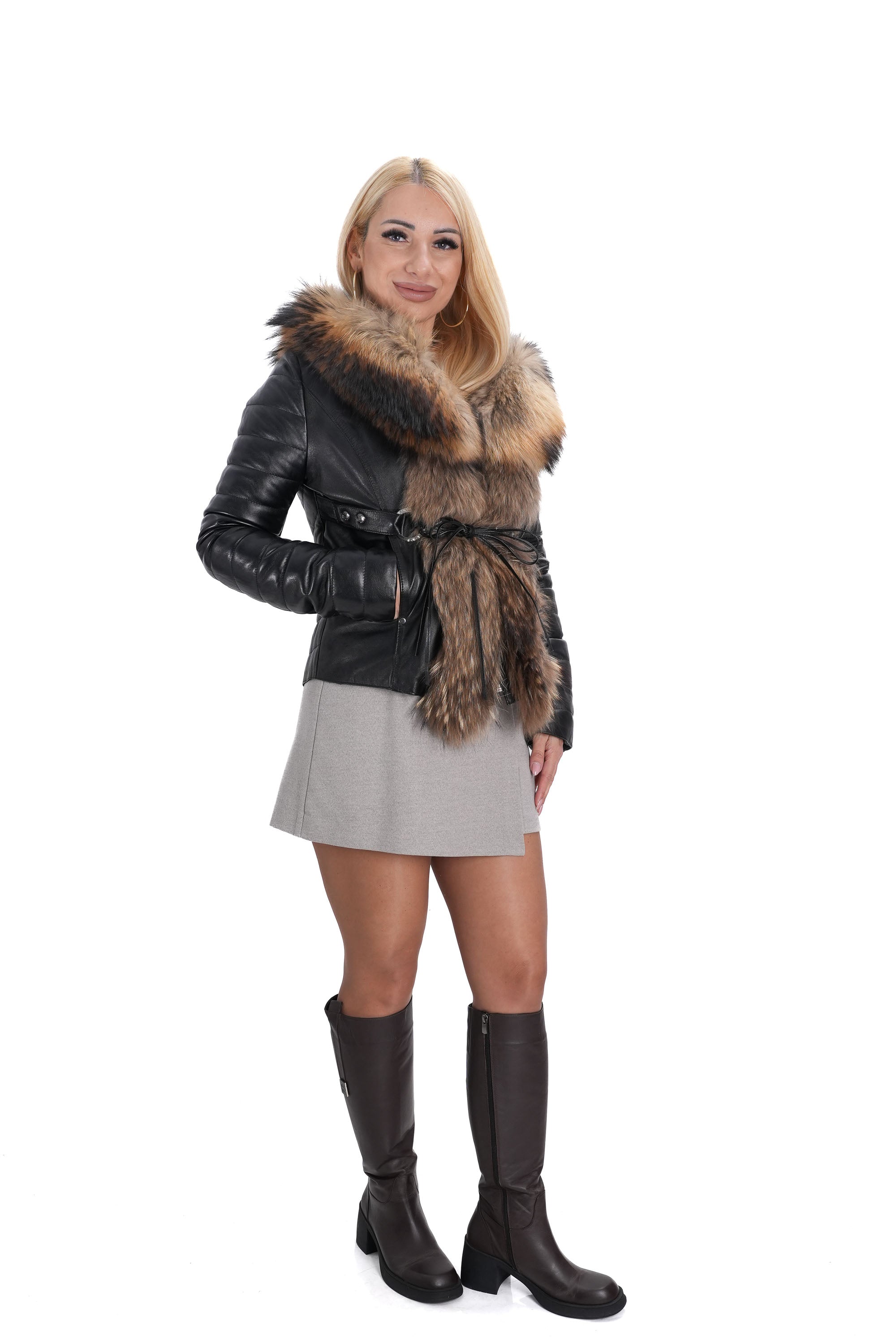 Открийте перфектната комбинация от стил, топлина и комфорт с това дамско яке от естествена кожа K-106. Изработено от висококачествена кожа в класическо черно, якето е оборудвано с богата яка от естествен косъм на качулката и отпред на ципа в натурален кафяв цвят, която придава изискан и луксозен вид.