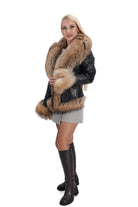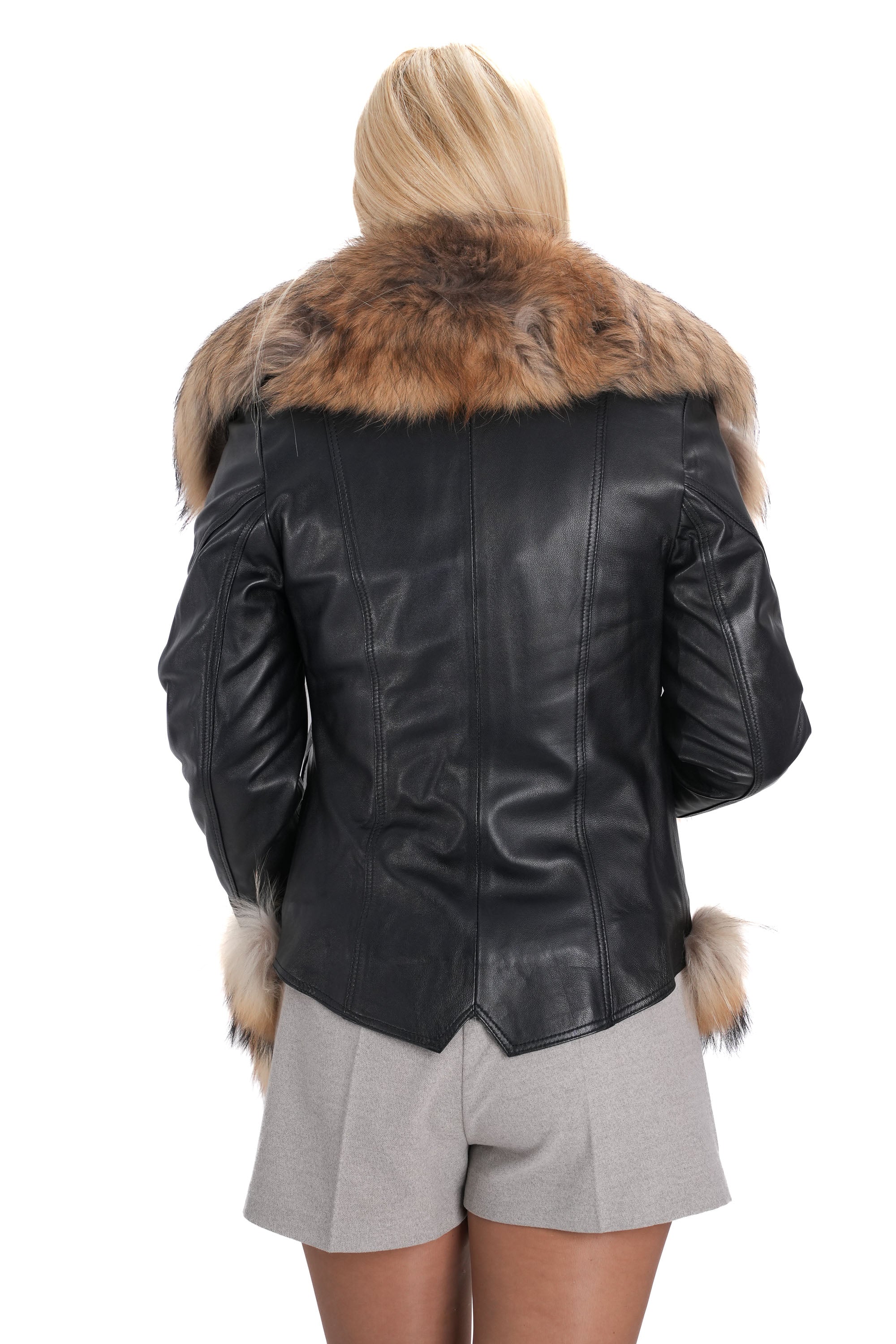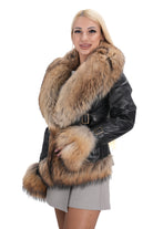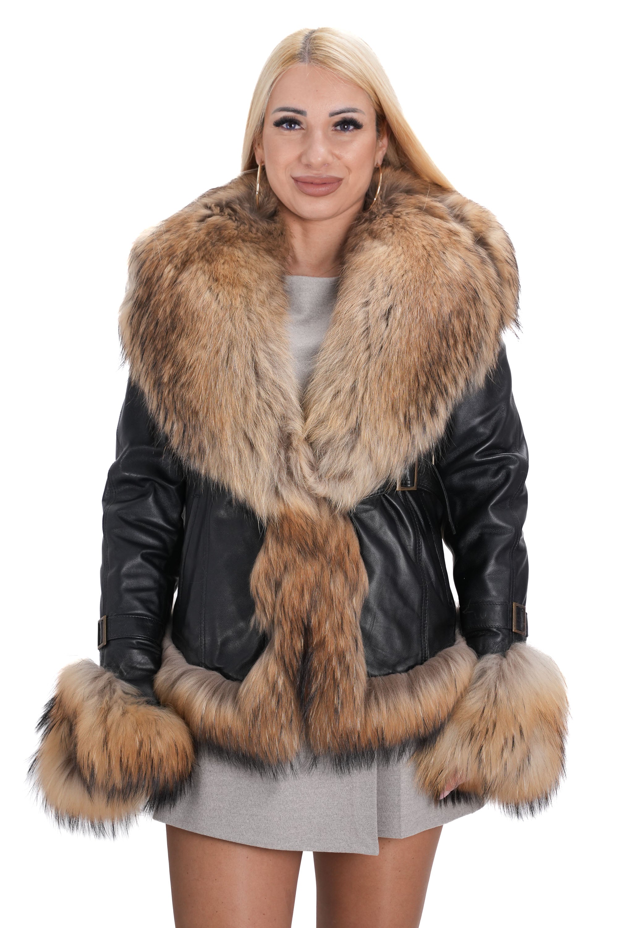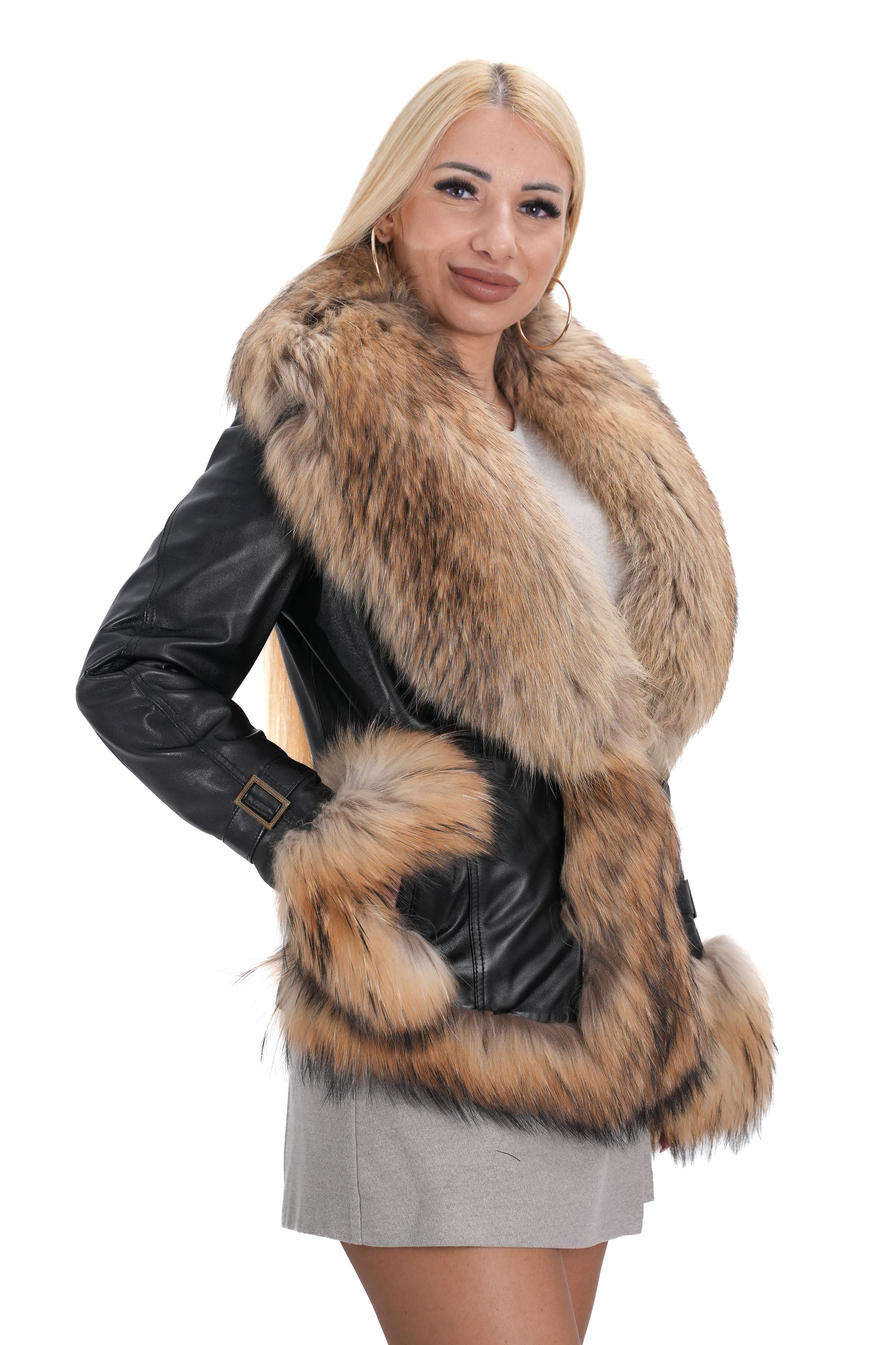 Дамско яке от естествена кожа с голяма богата яка и елементи от естествен косъм в натурална кафява лисица C-10 Natural