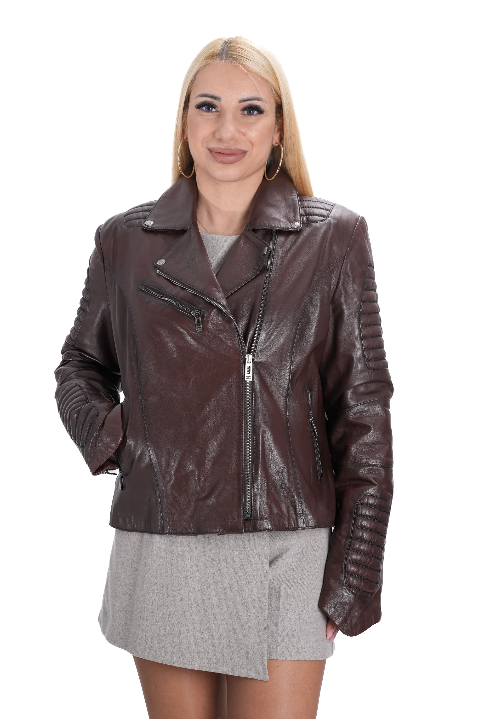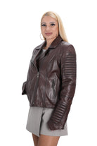 Дамско яке от естествена кожа в кафяво B-74, големи размери, съчетава стил, комфорт и модерен дизайн.