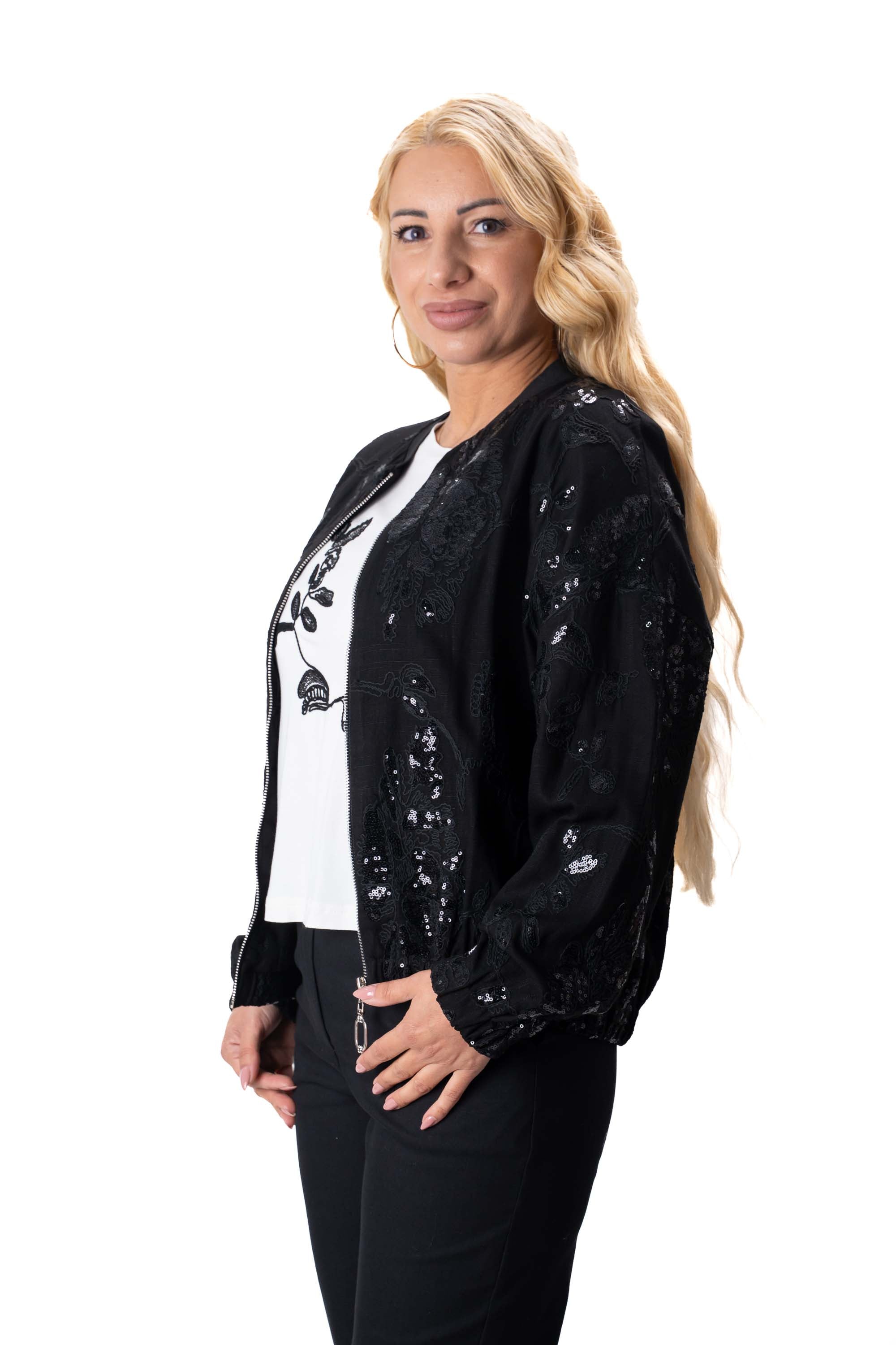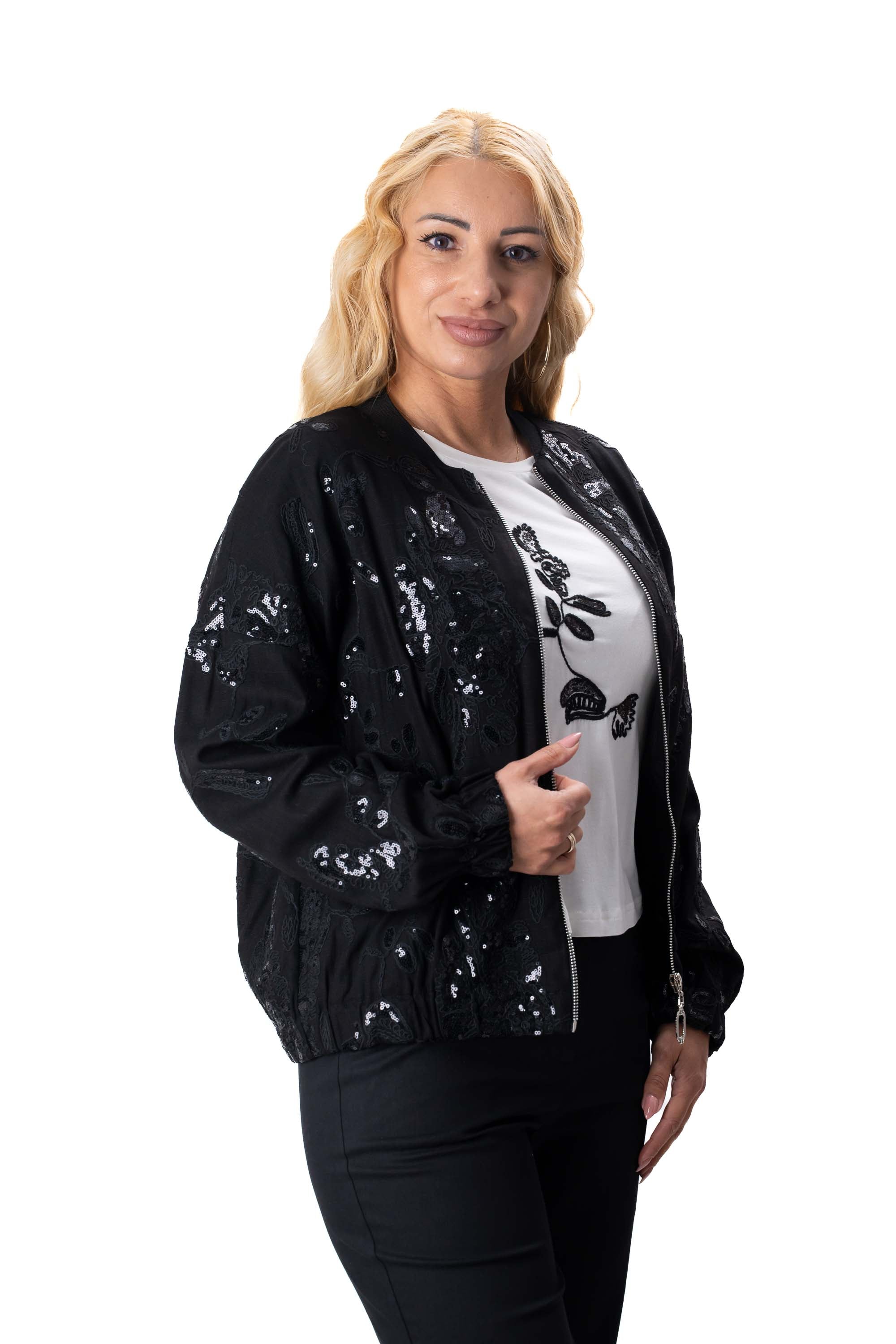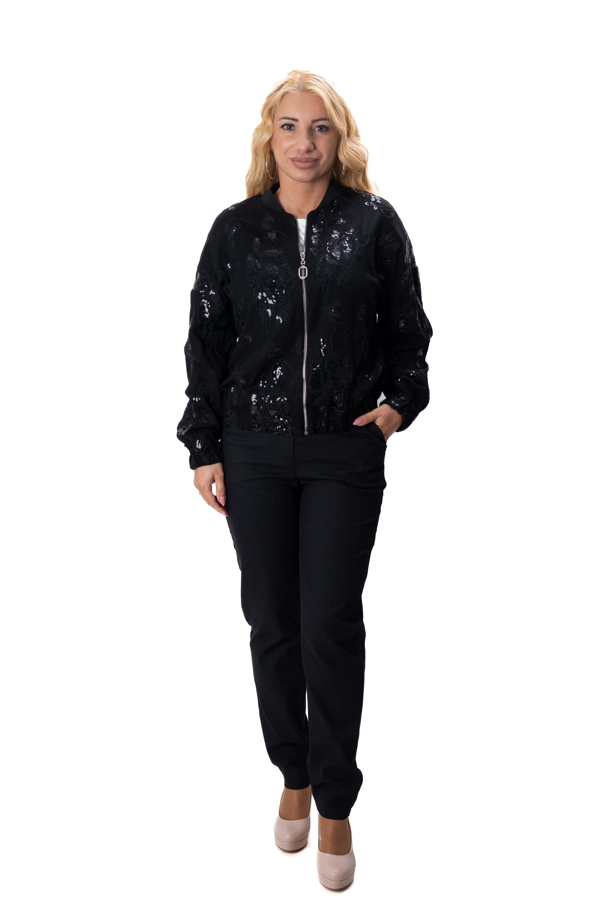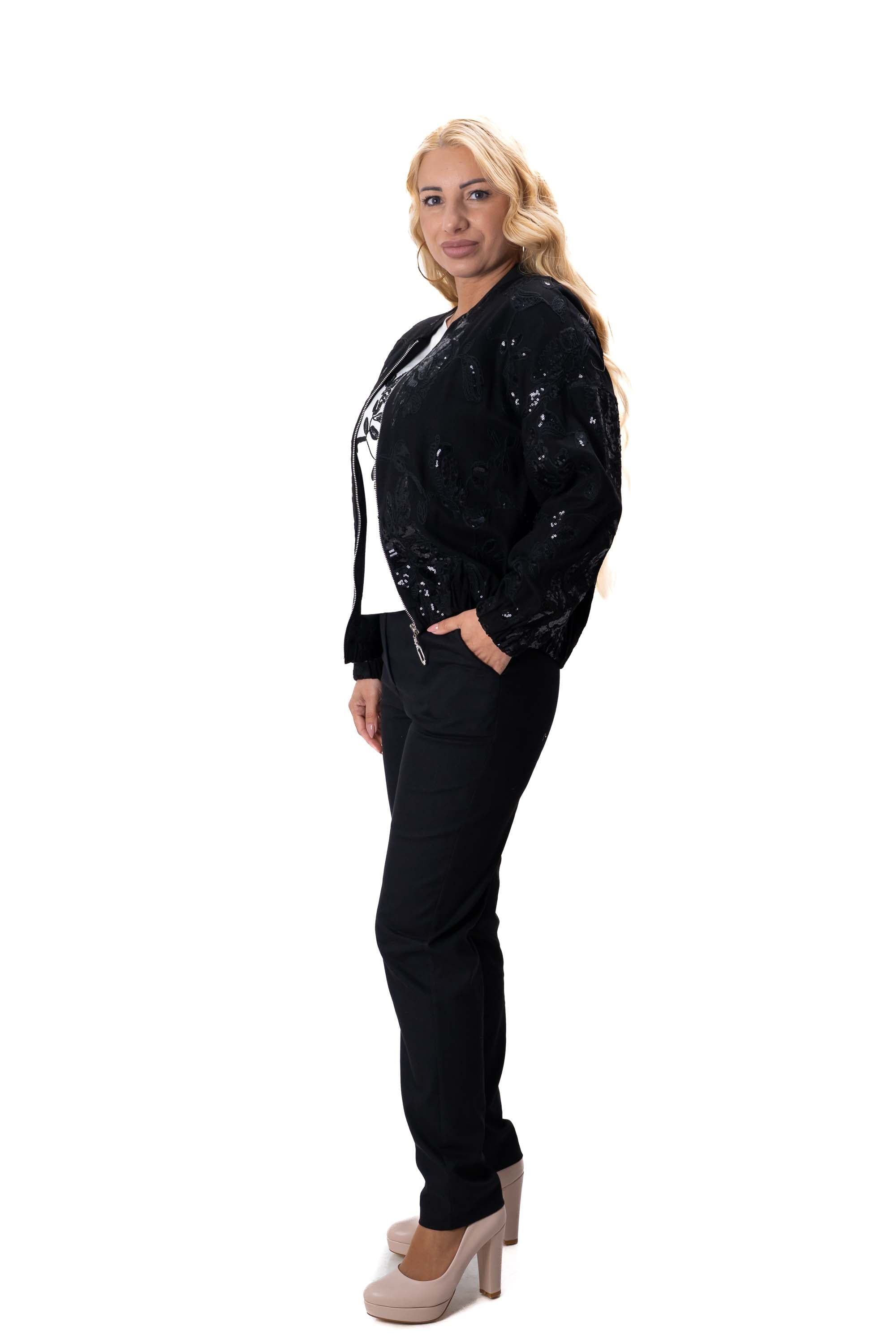 Дамски комплект от 3 части ленен с прав панталон и суитшърт с пайети в черно + бяла тениска 7452