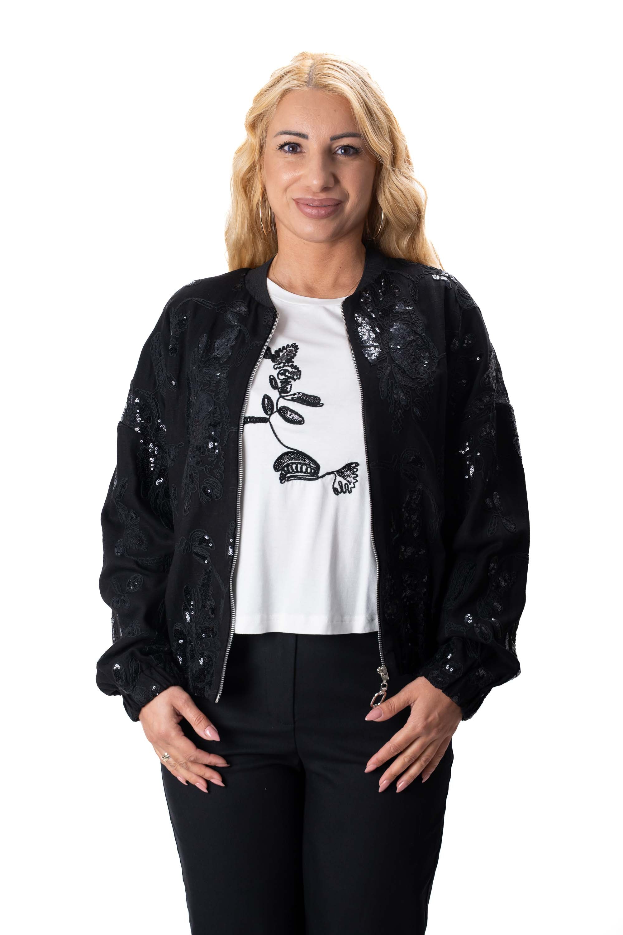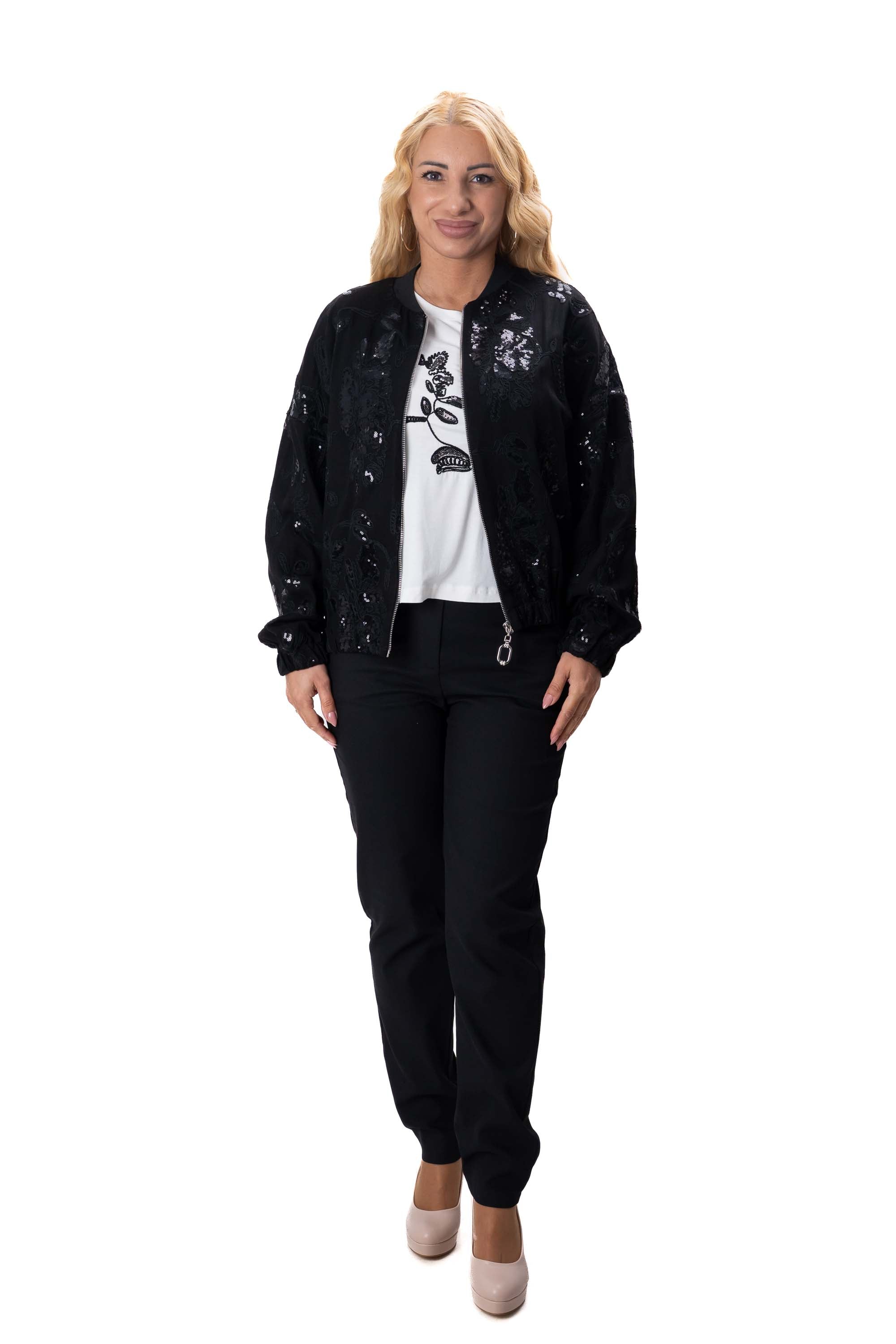 Правият панталон създава елегантен силует и осигурява удобство при носене. Суитшъртът с пайети добавя модерен акцент и придава стилна и леко бляскава визия на комплекта. Бялата тениска допълва перфектно сетa и позволява лесни комбинации с други дрехи.