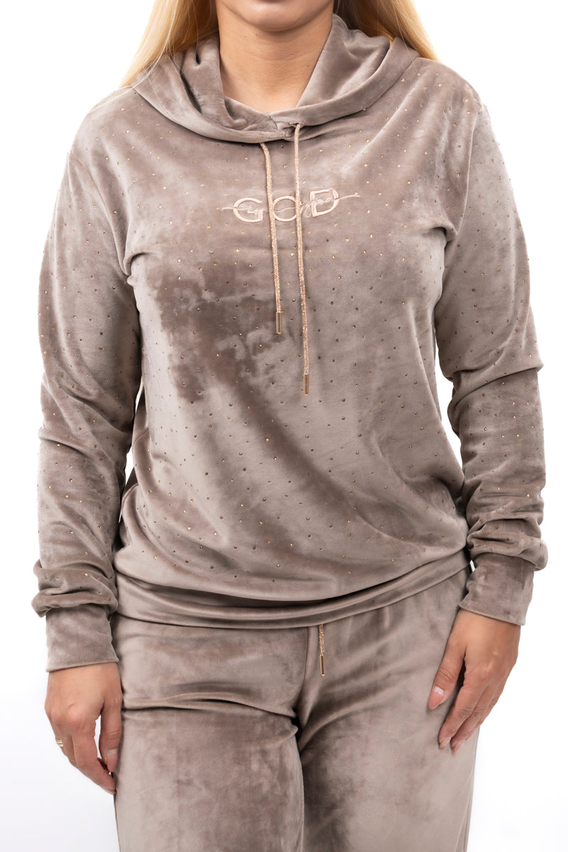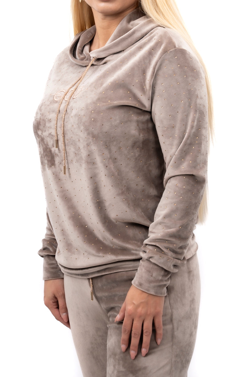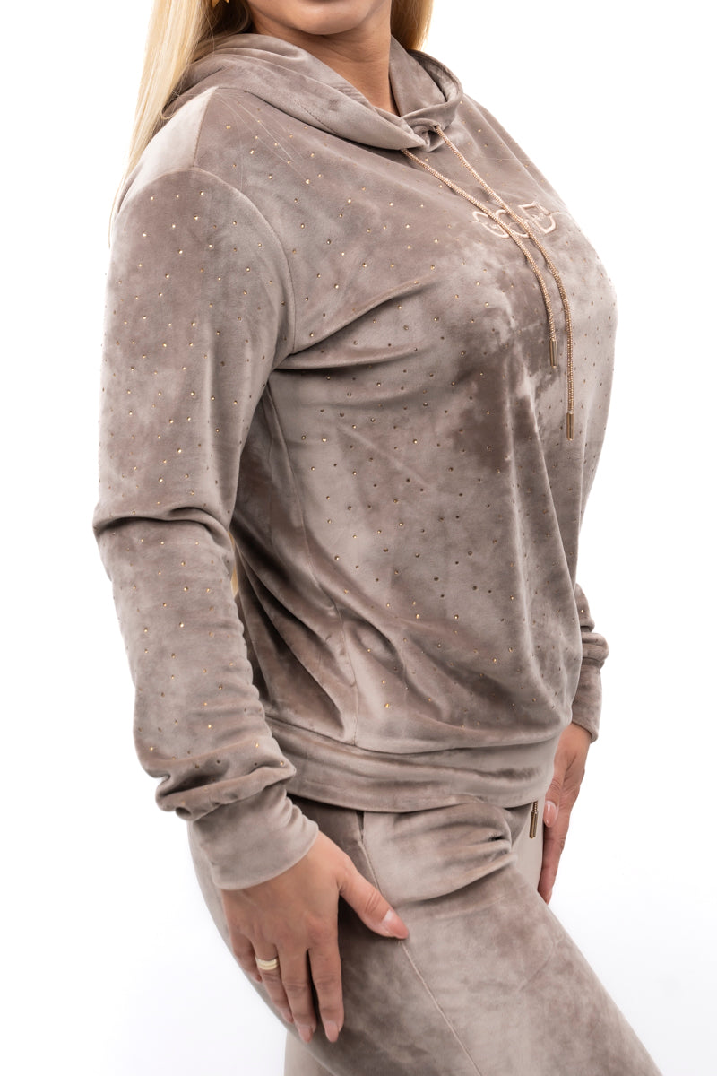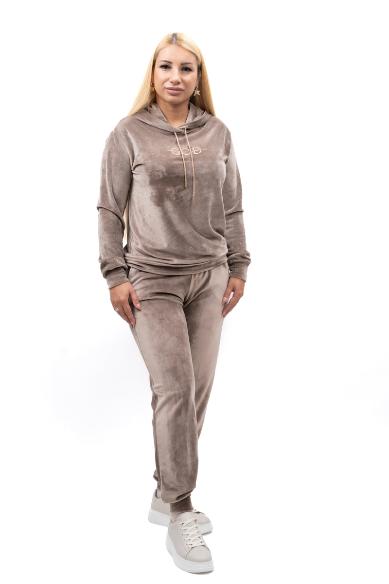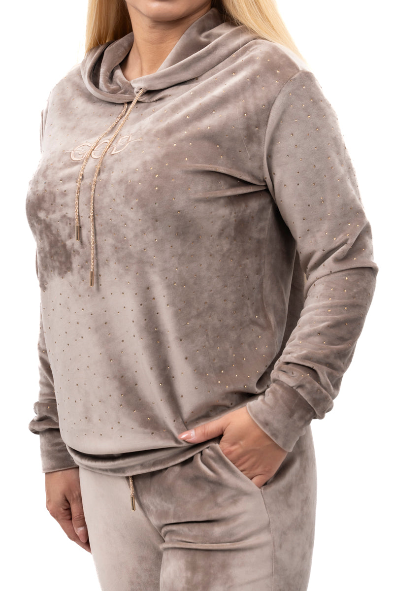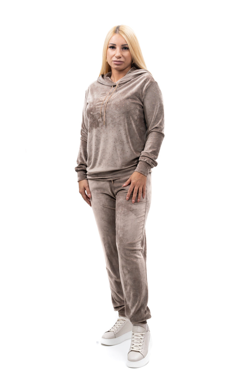 Дамски комплект спортно-елегантен от 2 части от мек плюш със златни кристали и качулка 22-8028