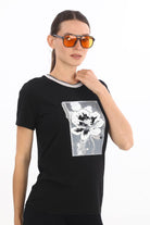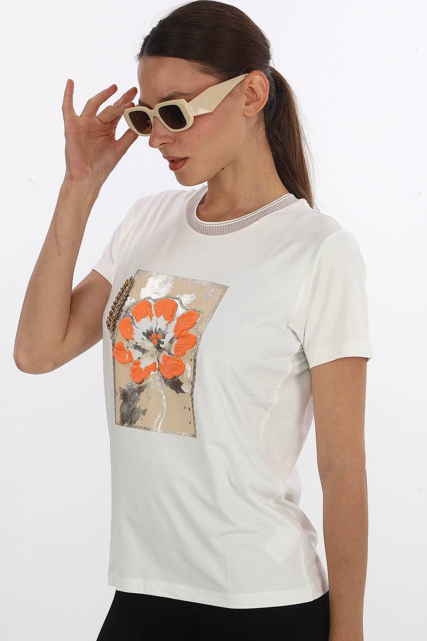 Дамска блуза тениска с къс ръкав в бяло със златен принт и оранжево цвете и камъни 37811-002