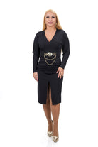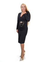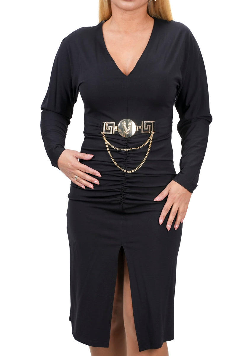 Дамска рокля елегантна миди под коляното в черно със златна катарама 44103